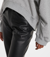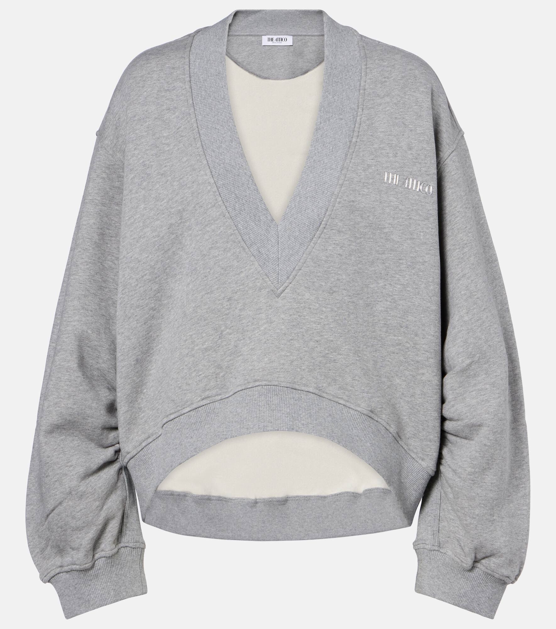 The Attico’s message is simple – it’s time to dress up. This sweatshirt is made from pure cotton fleece and has a plunging V-shaped neckline. Product Details - Material: 100% cotton - Care instructions: hand wash - Made in Portugal - Designer color name: Light Grey Melange - Item color: gray - Material II: 95% cotton, 5% elastane - Collar: V-neck - Cuff: ribbed - Hem: ribbed, uneven - Item number: P01046028 Size & Fit - True to size - Dropped shoulders - Oversized - Slightly stretchy fabric - Falls to the hip - The model seen in the picture is 178cm-5'10" and wearing a size IT 40