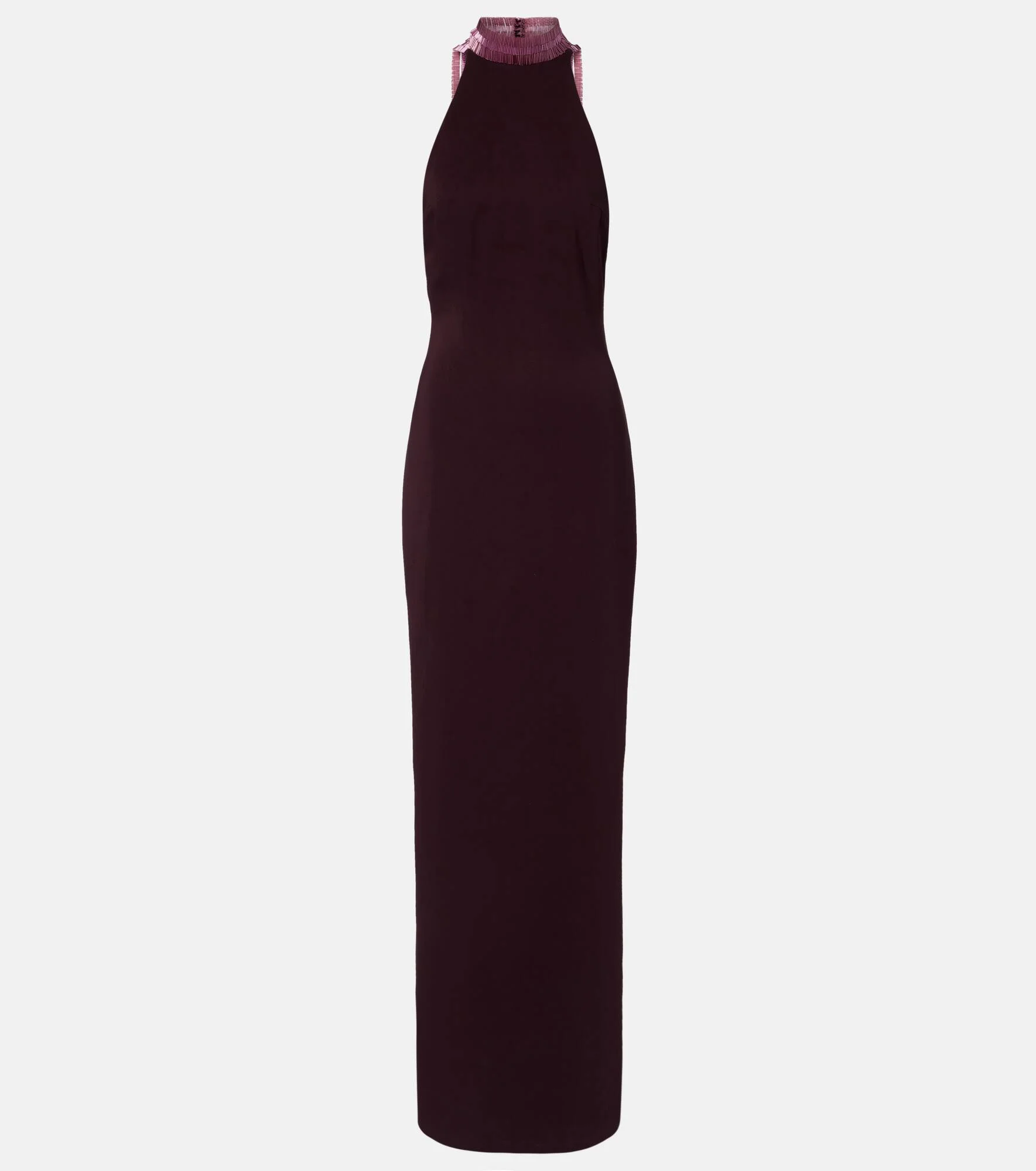 The Attico’s message is simple: It’s time to dress up. Turn heads in this floor-grazing gown, crafted from a fluid satin with a hint of stretch, and detailed with an embellished high neck for a dazzling finish. Product Details - Material: 94% viscose, 6% elastane - Care instructions: dry clean - Made in Italy - Color: burgundy - Designer color name: Drak Grapes - Item color: burgundy - Lining: 65% acetate, 35% polyester - Details: 100% glass - Closure: hook-fastening back, concealed zipped side - Long vent - Includes: garment bag - Item number: P01107562 Size & Fit - True to size - Low back - Fitted - Non-stretchy fabric - The model seen in the picture is 178cm-5'10" and wearing a size IT 40