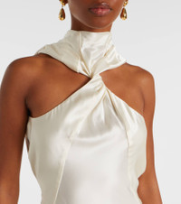 The Attico’s message is simple – it’s time to dress up. Made in Italy from a satin fabric, the gown has a fitted, halterneck silhouette with a twisted gathering on the chest. The design is finished with a zipped back. Product Details - Material: 100% viscose - Care instructions: dry clean - Made in Italy - Designer color name: Ivory - Item color: white - Closure: zipped back - Item number: P01045953 Size & Fit - True to size - Low back - Cinched waist - Non-stretchy fabric - The model seen in the picture is 178cm-5'10" and wearing a size IT 40