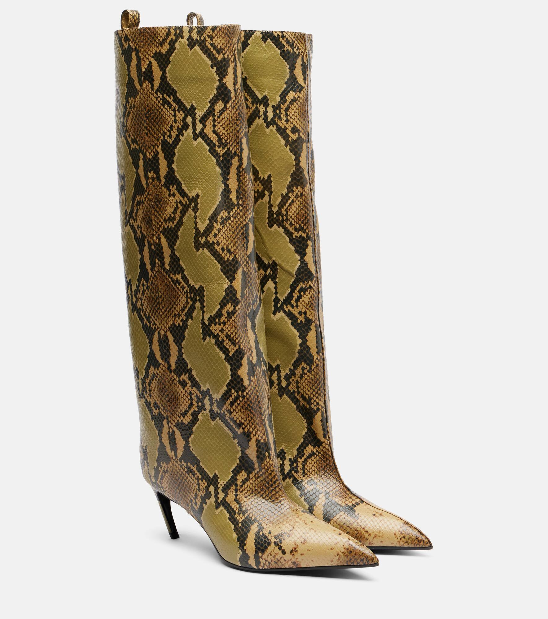 The Attico delivers a clear message: it’s time to dress up. Crafted in Italy from supple leather, the Lea knee-high boots stand out with a distinctive 65 mm heel, a sharply pointed toe, and a bold snake-print. Product Details - Upper: leather - Lining: leather - Sole: leather insole and sole - Toe shape: pointed toe - Made in Italy - Includes: dust bag, shoe box - Designer color name: Black + Dune - Item color: green, multicolor - Item number: P01069454 Size & Fit - Fits slightly large to size - we recommend trying a half size smaller - European sizes - 6,5cm-2.5" heel (size EU 38) - 42cm-16.5" shaft height (size EU 38) - 39cm-15.5" shaft width (size EU 38) - shaft width measured on largest part of boot