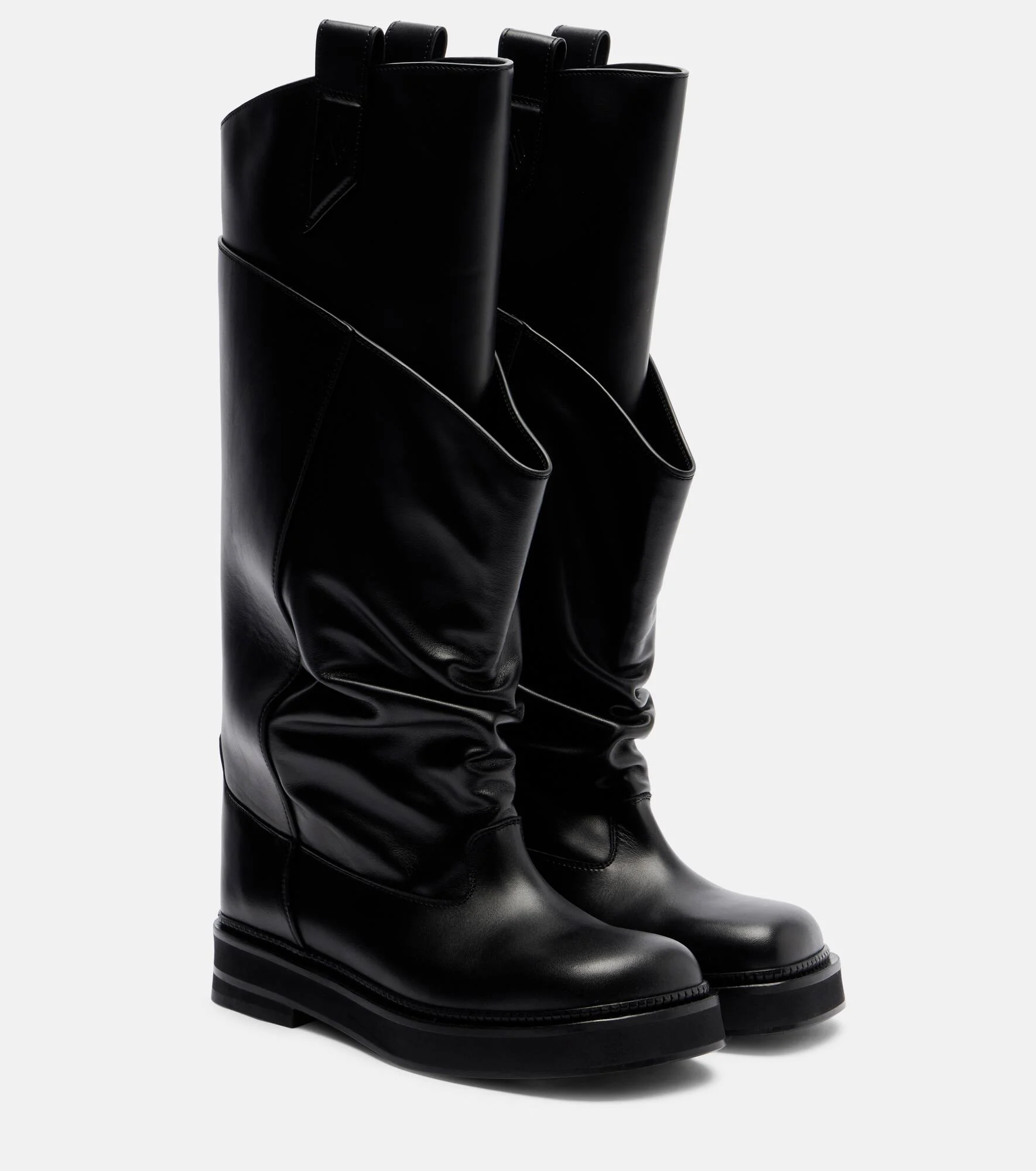 The Attico puts a refreshing twist on a classic style with the Passeggiata combat boots. Italian-crafted from supple leather, this design features curved draped shafts that create a layered effect. Product Details - Upper: calf leather - Lining: leather - Sole: leather insole and sole - Toe shape: square toe - Made in Italy - Includes: shoe box, dust bag - Designer color name: Black - Item color: black - Item number: P01128786 Size & Fit - Fits slightly large to size - we recommend trying a half size smaller - European sizes - 4cm-1.5" heel (size EU 38) - 2,5cm-1" platform (size EU 38) - 39cm-15.5" shaft height (size EU 38) - 38cm-15" shaft width (size EU 38) - shaft width measured on largest part of boot