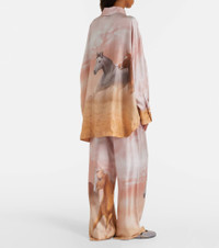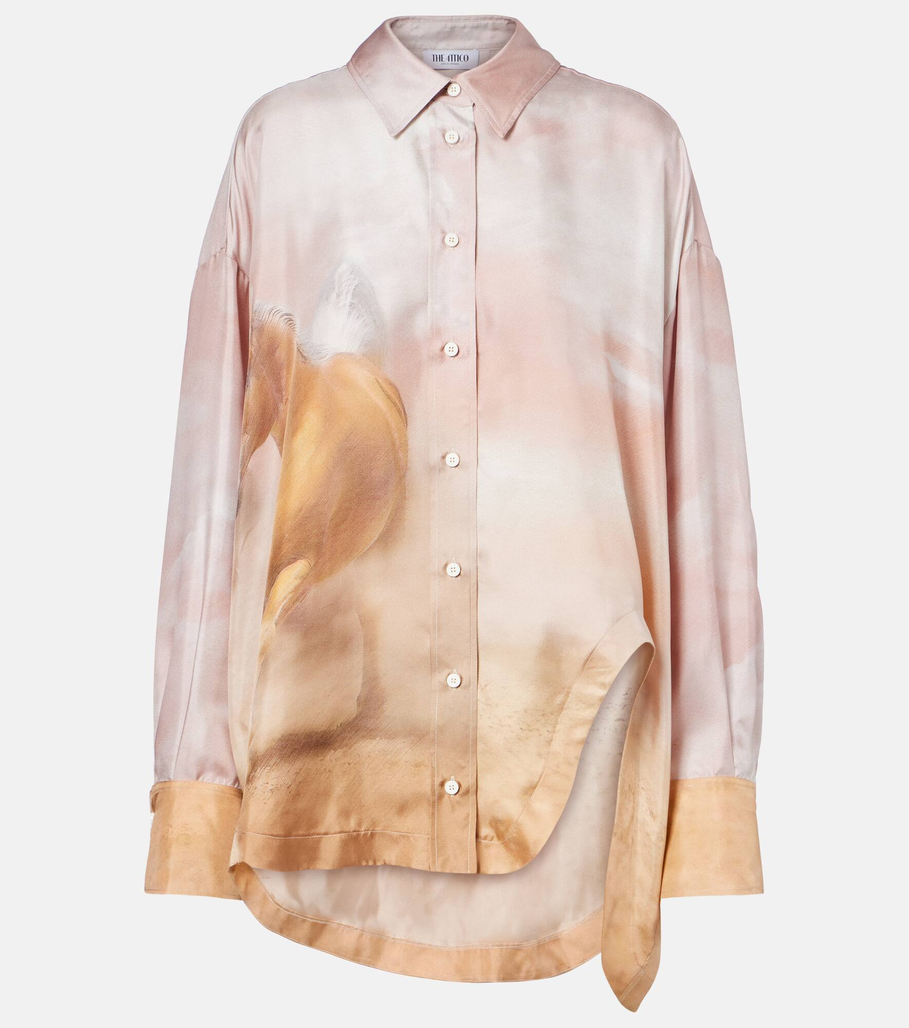 The Attico’s message is simple – it’s time to dress up. This shirt has an oversized fit and features a print of two running horses on a lustrous silk twill backdrop. Product Details - Material: 100% silk - Care instructions: dry clean - Made in Italy - Designer color name: Pink Shades - Item color: pink, beige - Closure: buttoned placket - Collar: classic (Straight point) - Cuff: one button - Side slits - Item number: P01046030 Size & Fit - True to size - Dropped shoulders - Oversized - Non-stretchy fabric - Falls below the hip - The model seen in the picture is 178cm-5'10" and wearing a size IT 40
