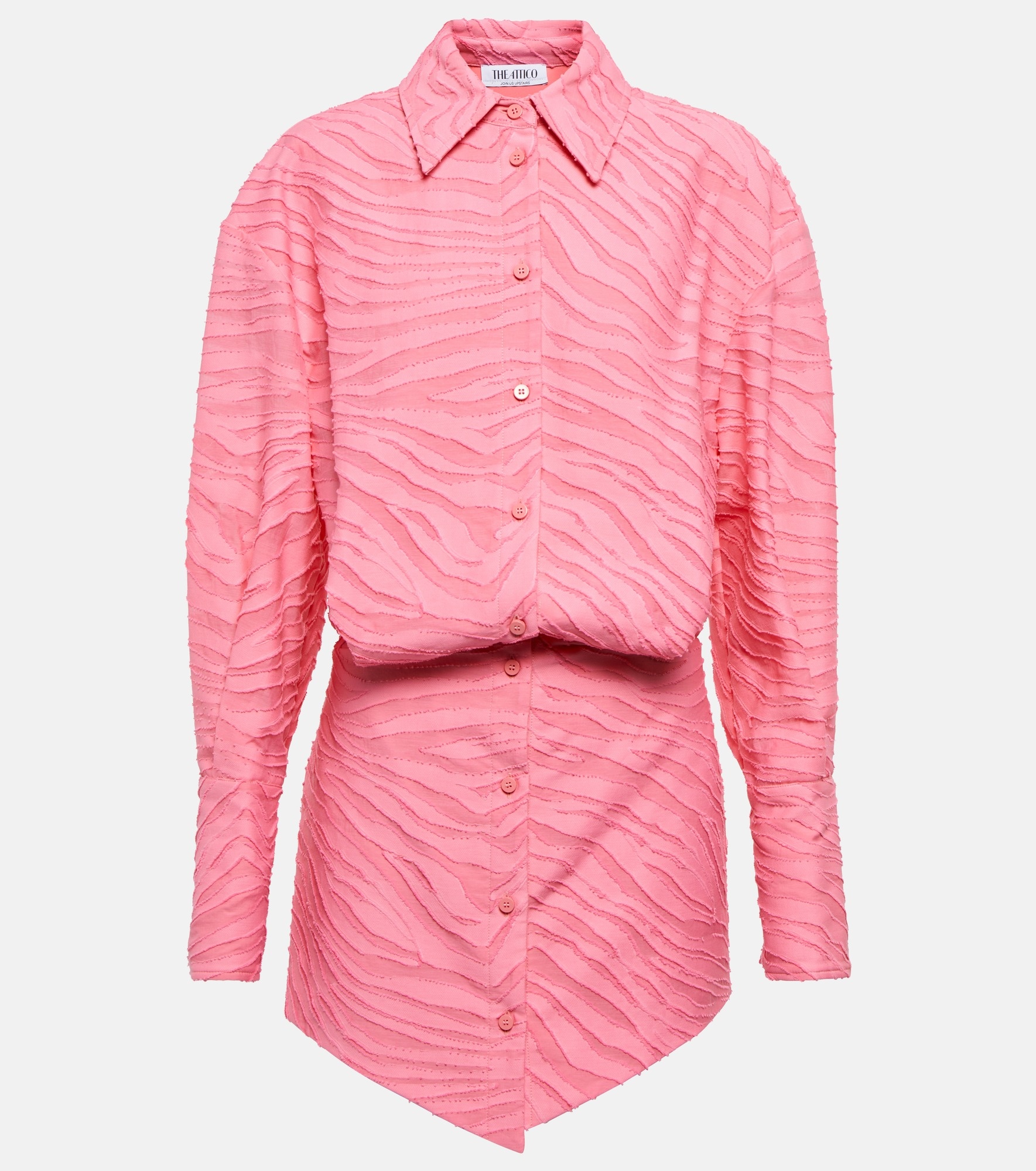 "Getting dressed is an emotional act," muse The Attico founders Gilda Ambrosio and Giorgia Tordini, whose Spring/Summer '23 collection is all about love. A brand signature style, the Silvye shirt dress is updated in pink cotton-blend fil coupé with tonal zebra stripes and a gathered waist. Product Details - Material: 93% cotton, 7% polyamide - Made in Italy - Closure: buttoned front - Comes with garment bag - Care instructions: hand wash - Item number: P00741863 Size & Fit - Fits large to size - we recommend trying one size smaller - Dropped shoulders - Loose bodice, fitted skirt - Mid-weight material - The model seen in the picture is 178cm-5'10" and wearing a size IT 38