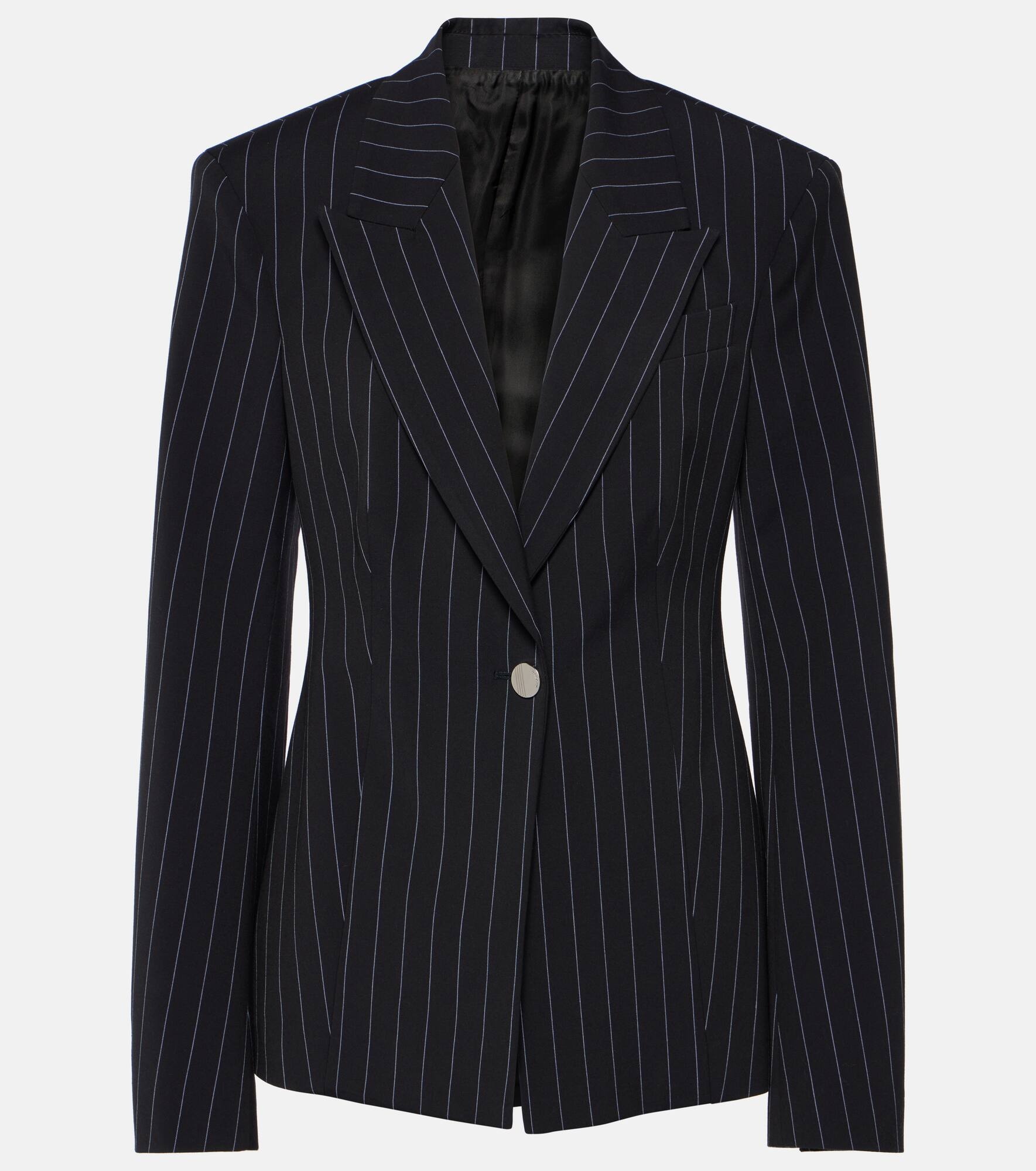 Product Details - Material: 65% polyester, 33% viscose, 2% elastane - Cuff: four buttons - Pockets: breast pocket - Shoulder construction: structured - Jacket construction: soft structured - Comes with garment bag - Care instructions: dry clean - Made in Italy - Designer color name: Blue Navy/Light Blue - Lining: 100% viscose - Fully lined - Closure: single-breasted (one button) - Peak lapel - Item number: P00887059 Size & Fit - True to size - Oversized shoulders - Shoulder pad inserts - Cinched waist - Non-stretchy fabric - Falls below the hip - The model seen in the picture is 178cm-5'10" and wearing a size IT 40