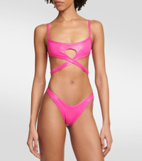 Marrying confidence-boosting silhouettes with high-tech materials, The Attico swimwear is made to flatter. This bikini has a square design that wraps around and ties at the back and slip-on bikini bottoms. Product Details - Made in Italy - Care instructions: machine wash at 30 degrees - Material: 82% polyamide, 18% elastane - Designer color name: Fuchsia - Item number: P00748441 Size & Fit - True to size - Please note: small cups - Minimal coverage - High-cut leg - The model seen in the picture is 178cm-5'10", cup size B, and wearing a size XS - Unpadded Top