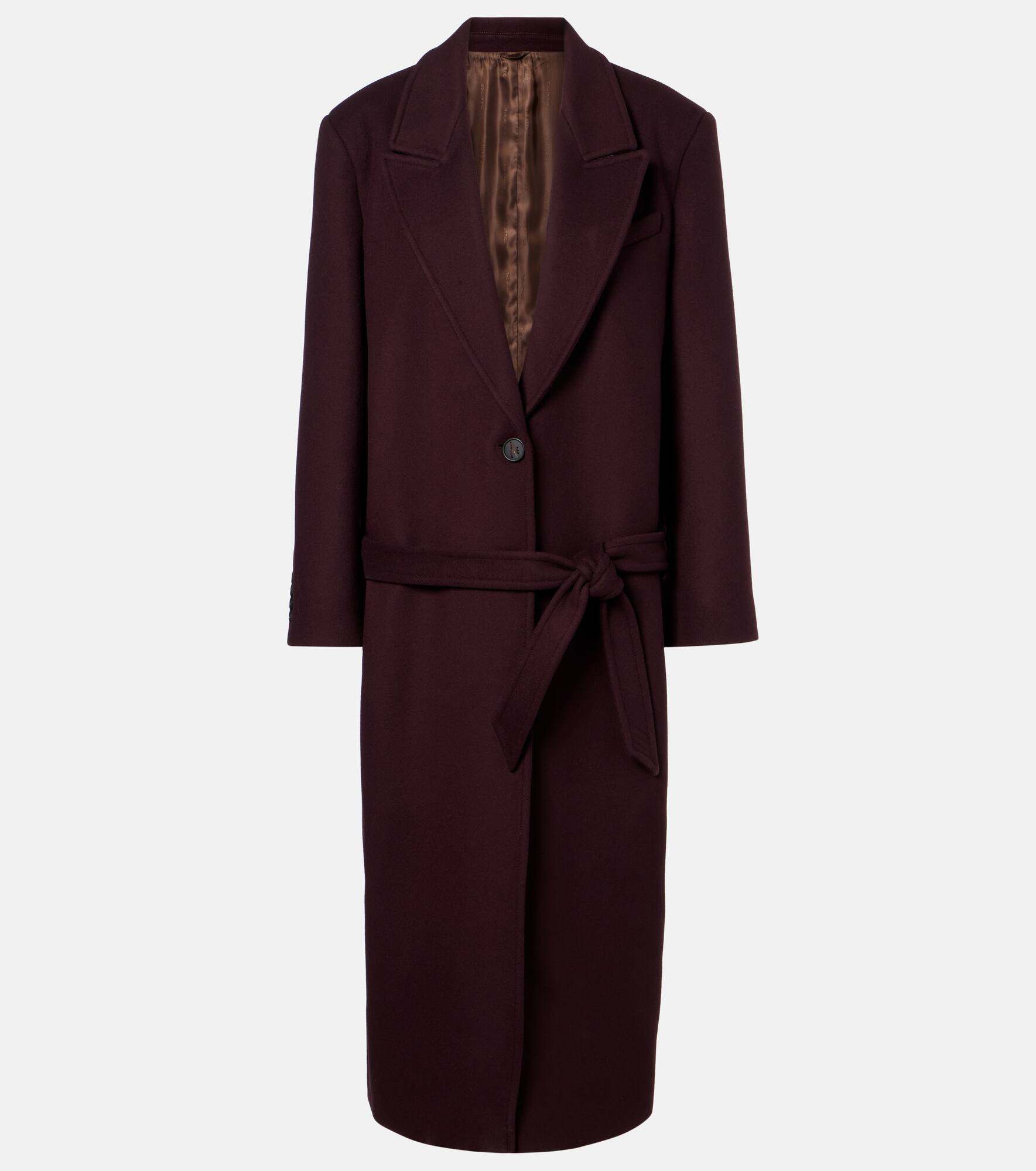 The Attico’s message is simple – it’s time to dress up. This coat has structured shoulders and is made from a warm, mostly wool-blended twill. Product Details - Material: 75% wool, 25% polyamide - Care instructions: dry clean - Made in Italy - Designer color name: Burgundy - Item color: burgundy - Lining: 100% viscose - Closure: single-breasted (two buttons) - Detachable belt - Cuff: four buttons - Collar: notch neck - Item number: P01046024 Size & Fit - True to size - Shoulder pad inserts - Loose fit, comes with belt - Non-stretchy fabric - The model seen in the picture is 178cm-5'10" and wearing a size IT 40