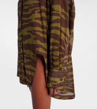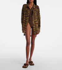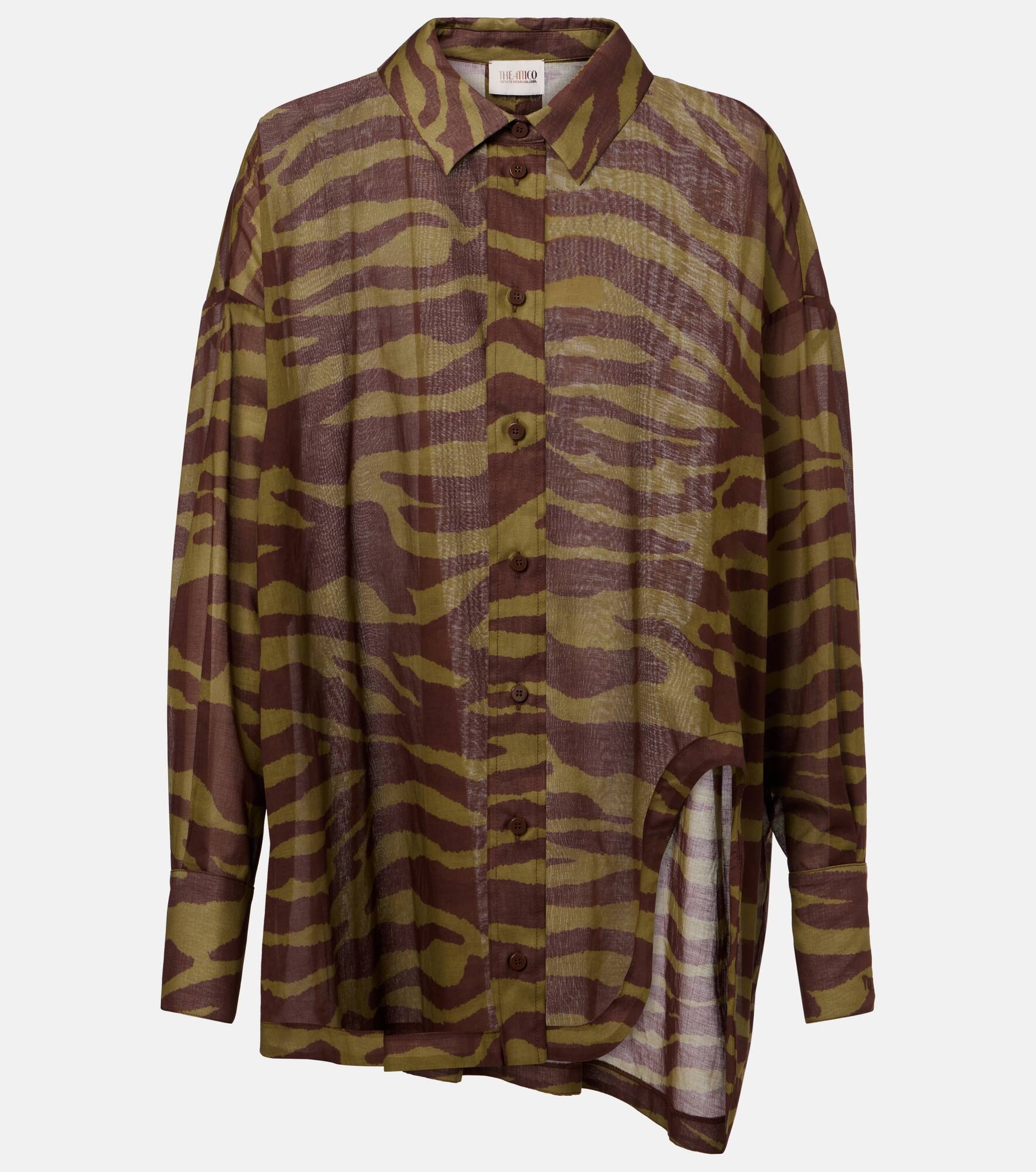 The Attico’s message is simple – it’s time to dress up. Case in point, this cotton muslin shirt is semi-sheer and features a relaxed silhouette, dropped shoulders, high-low hem, and all-over striking zebra print. Product Details - Material: 100% cotton - Care instructions: machine wash at 40 degrees - Made in Italy - Designer color name: Dark Green/ Dark Brown - Item color: brown, green - Closure: buttoned front - Cuff: one button - Item number: P01034823 Size & Fit - True to size - Dropped shoulders - Semi-sheer - Oversized - Non-stretchy fabric - Falls below the hip - The model seen in the picture is 178cm-5'10" and wearing a size IT 40