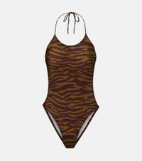 Create eye-catching getaway looks around this swimsuit from The Attico. Featuring an all-over zebra print, this style features a halterneck and high-cut legs. Product Details - Material: 80% polyamide, 20% elastane - Care instructions: hand wash - Made in Portugal - Designer color name: Dark Green/ Dark Green - Item color: green, brown - Lining: 84% polyester, 16% elastane - Closure: self-ties - Item number: P01034812 Size & Fit - Fits small to size - we recommend trying one size larger - Unpadded Top - High-cut leg - The model seen in the picture is 178cm-5'10", cup size B, and wearing a size S
