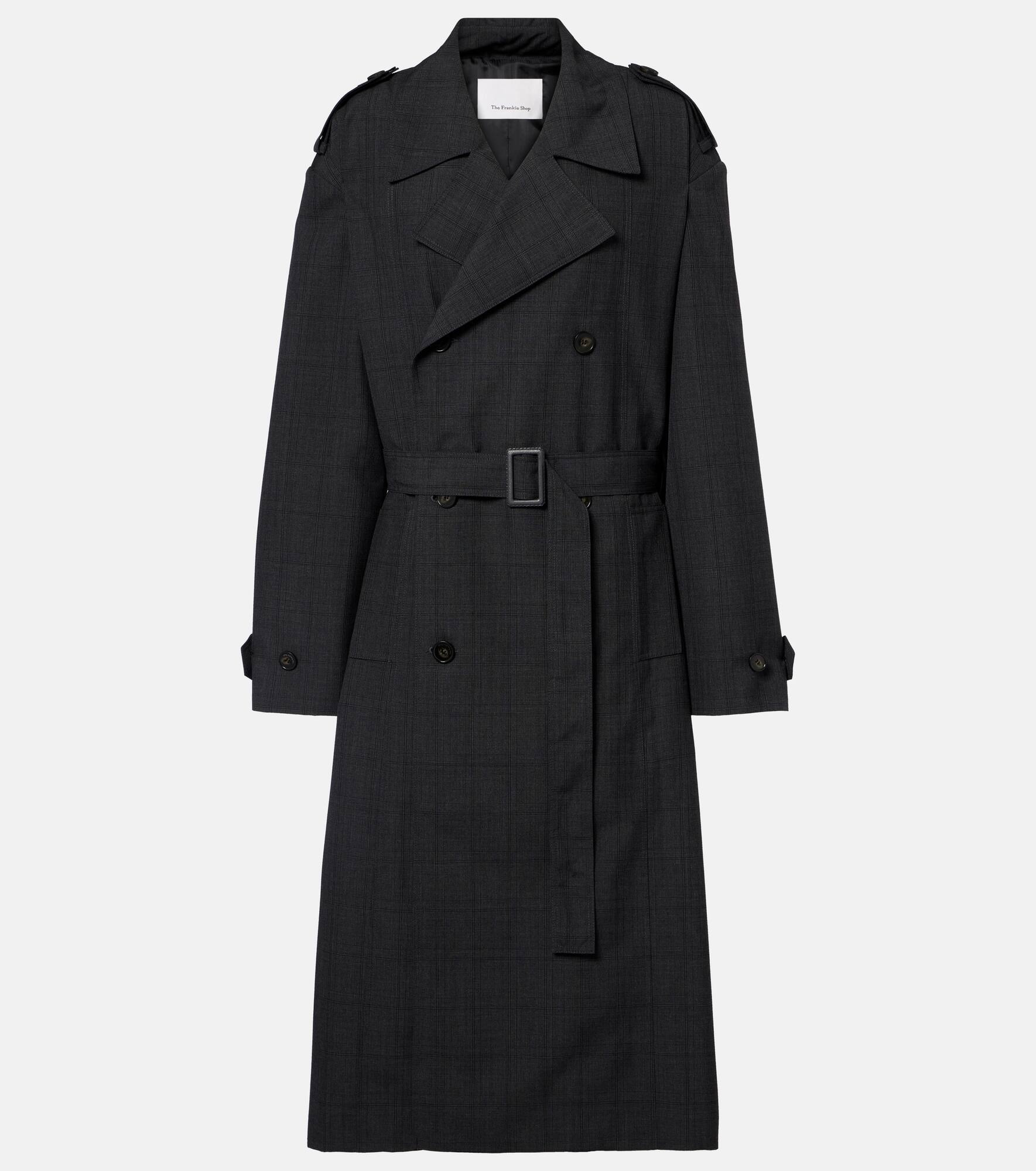 The Frankie Shop has captured the hearts of fashion insiders with their low-effort, high-impact essentials. The Bleecker trench coat is made from a wool-blend fabric with notched lapels, strong shoulders with epaulettes, and a matching belt. Product Details - Material: 55% polyester, 45% wool - Care instructions: dry clean - Made in Bosnia and Herzegovina - Designer color name: Dark Grey - Item color: gray - Lining: 100% polyester - Notched lapel - Epaulettes - Closure: double-breasted - Detachable belt - Pockets: side slit pockets - Cuff: tab cuff - Item number: P01100641 Size & Fit - Fits large to size - we recommend trying one size smaller - Shoulder pad inserts - Loose fit, comes with belt - Non-stretchy fabric - The model seen in the picture is 178cm-5'10" and wearing a size XS