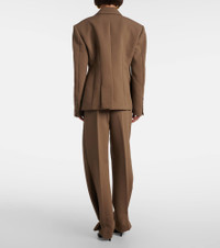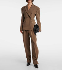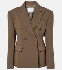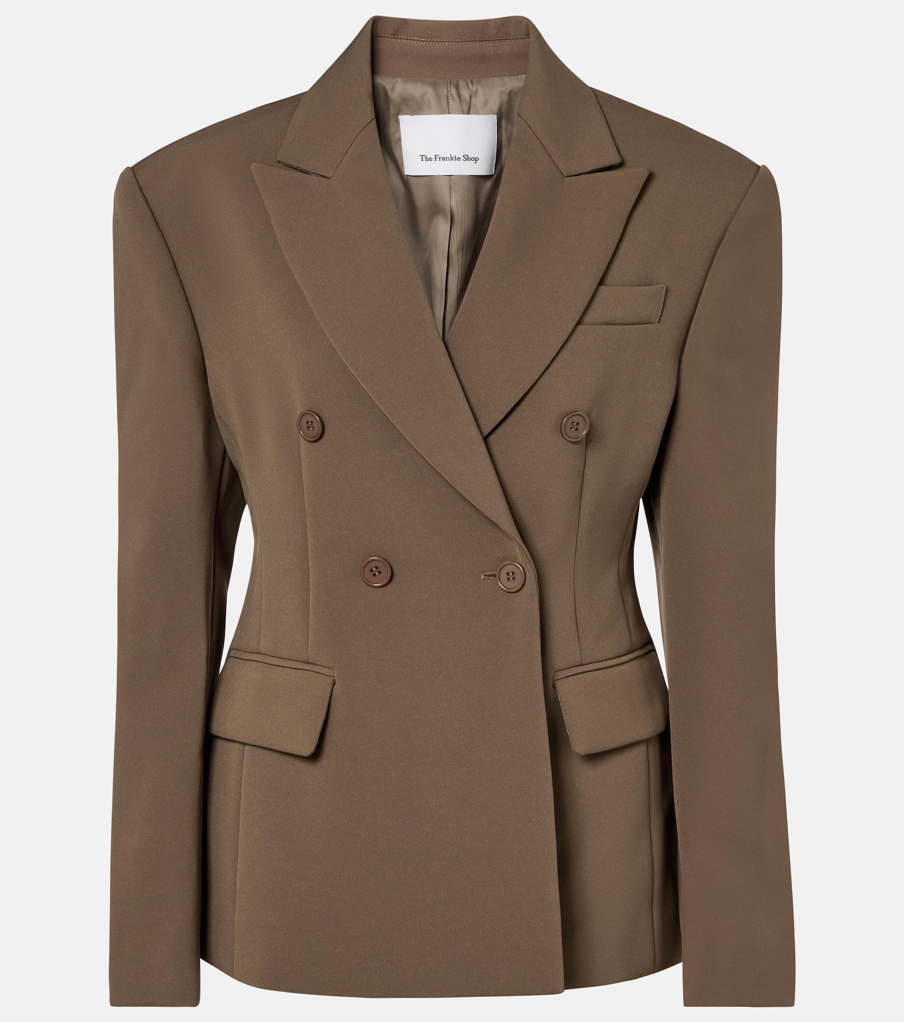 The Frankie Shop has captured the hearts of fashion insiders with their low-effort, high-impact essentials. Crafted from a mid-weight woven fabric, The Doyer blazer features a flattering cinched waist silhouette complete with double-breasted closure. Product Details - Material: 87.5% polyester, 12.5% acetate - Care instructions: machine wash at 30 degrees - Made in Korea - Designer color name: Moss Green - Item color: brown - Peak lapel - Shoulder pads - Closure: double-breasted (four buttons) - Cuff: four buttons - Pockets: ticket pocket, flap pockets - Vent: single - Fully lined - Item number: P01097069 Size & Fit - Fits large to size - we recommend trying one size smaller - Shoulder pad inserts - Cinched waist - Non-stretchy fabric - Falls below the hip - The model seen in the picture is 178cm-5'10" and wearing a size XS
