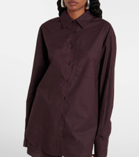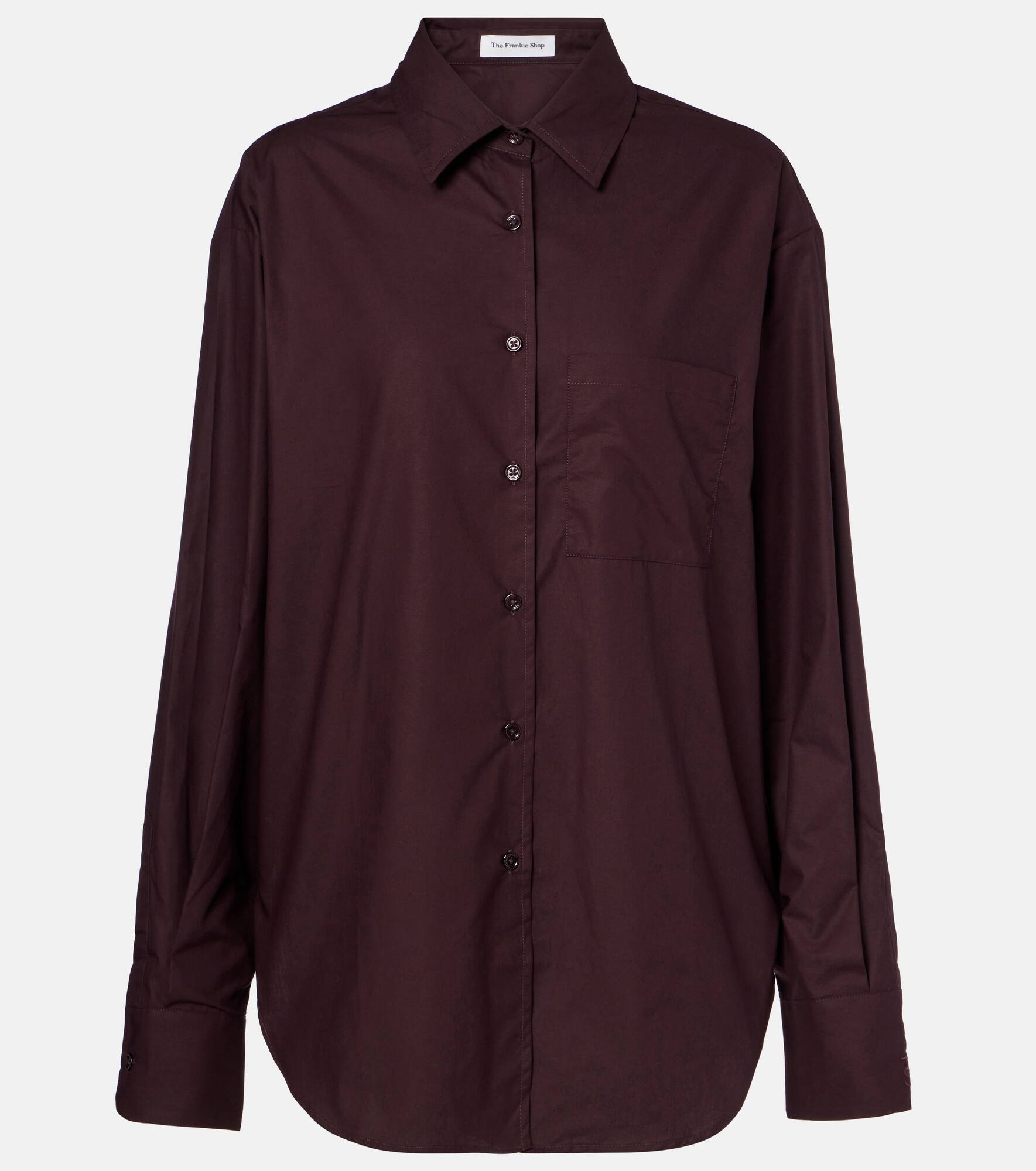 Crafted from lightweight cotton poplin, this shirt from The Frankie Shop is cut to a relaxed silhouette. This design features a curved hem and side slits. Product Details - Material: 100% cotton (organic) - Care instructions: machine wash at 30 degrees - Made in Morocco - Designer color name: Dark Plum - Item color: brown - Lining: 100% cotton (organic) - Collar: classic (Straight point) - Closure: buttoned front - Hem: rounded - Cuff: one button - Item number: P01075517 Size & Fit - True to size - Dropped shoulders - Oversized - Falls below the hip - The model seen in the picture is 178cm-5'10" and wearing a size XS