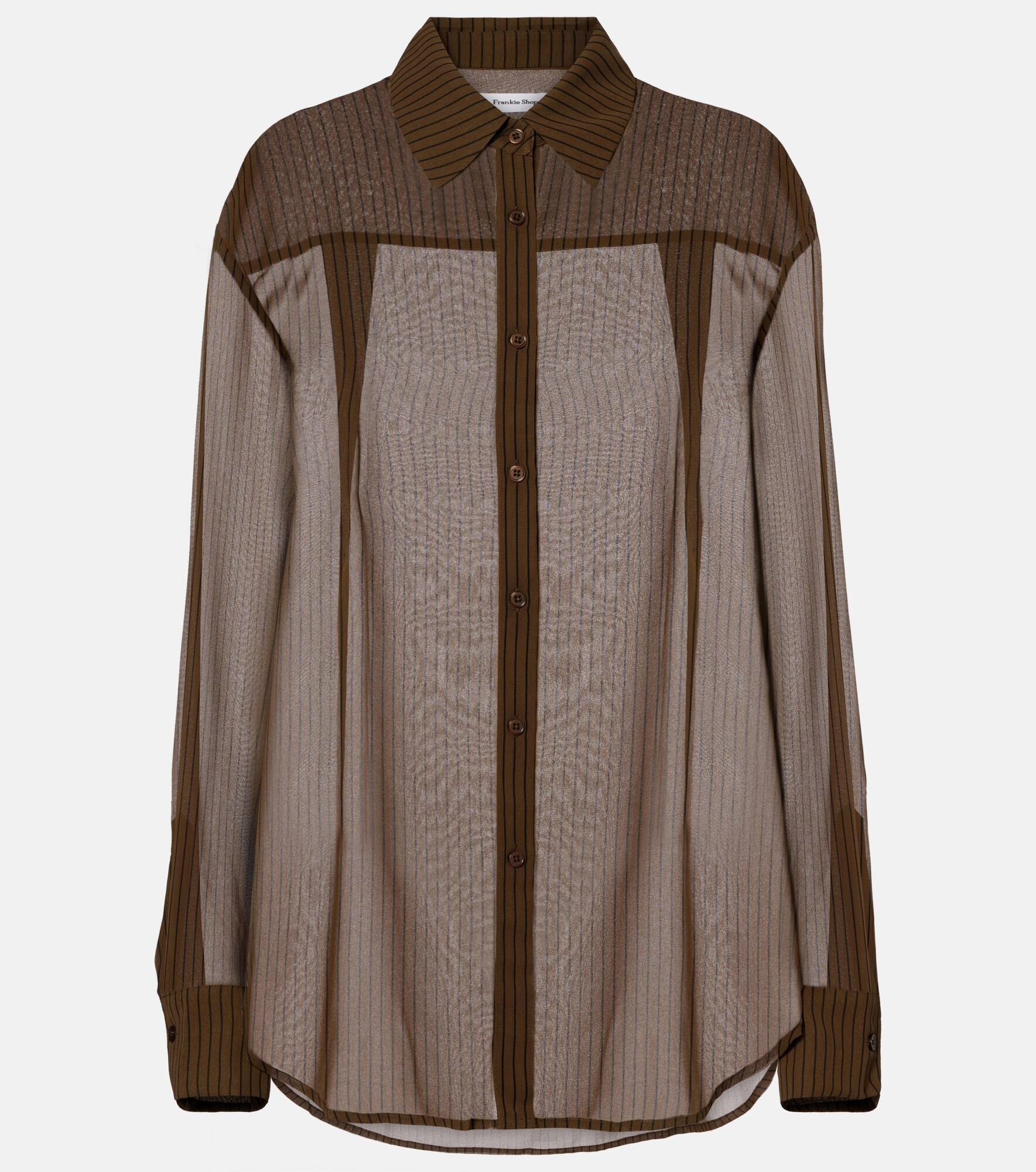 The Frankie Shop has captured the hearts of fashion insiders with their low-effort, high-impact essentials. The Peri shirt boasts a timeless pinstripe motif, a sheer finish, and dropped shoulders for a relaxed look. Product Details - Material: 100% polyester - Care instructions: dry clean - Made in China - Designer color name: Olive/Black Stripe - Item color: green, black - Collar: classic (Straight point) - Cuff: buttoned - Closure: buttoned front - Item number: P01097096 Size & Fit - True to size - For a closer fit, we recommend taking one size down - Dropped shoulders - Sheer - Designed for a loose fit - Non-stretchy fabric - Falls below the hip - The model seen in the picture is 178cm-5'10" and wearing a size XS