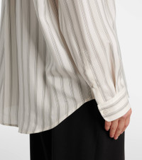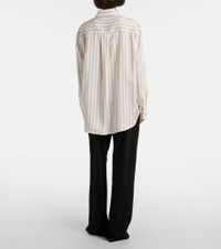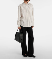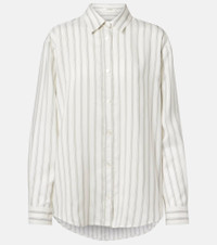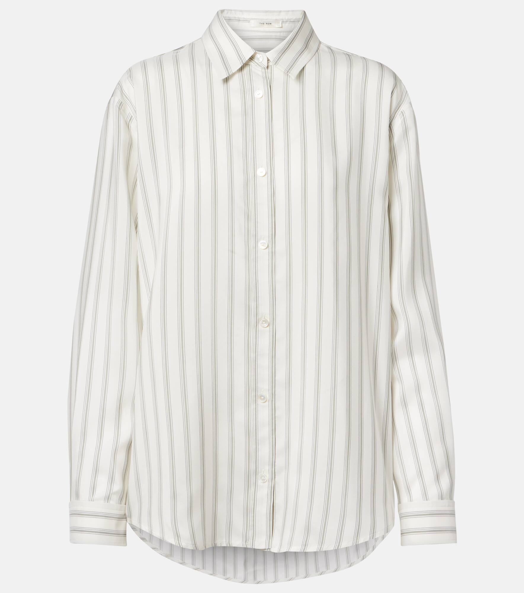 The Eirlys shirt showcases how The Row's impeccable craft and meticulous attention to detail can elevate even the simplest styles. Made from striped silk poplin, the design features a curved hem and relaxed silhouette. Product Details - Material: 100% silk - Care instructions: dry clean - Made in Italy - Designer color name: Grey Stripe - Item color: gray, white - Contains non-textile parts of animal origin - Collar: classic (Straight point) - Cuff: buttoned - Closure: buttoned front - Hem: rounded - Item number: P01076672 Size & Fit - True to size - Designed for a loose fit - Non-stretchy fabric - Falls below the hip - The model seen in the picture is 178cm-5'10" and wearing a size US 4