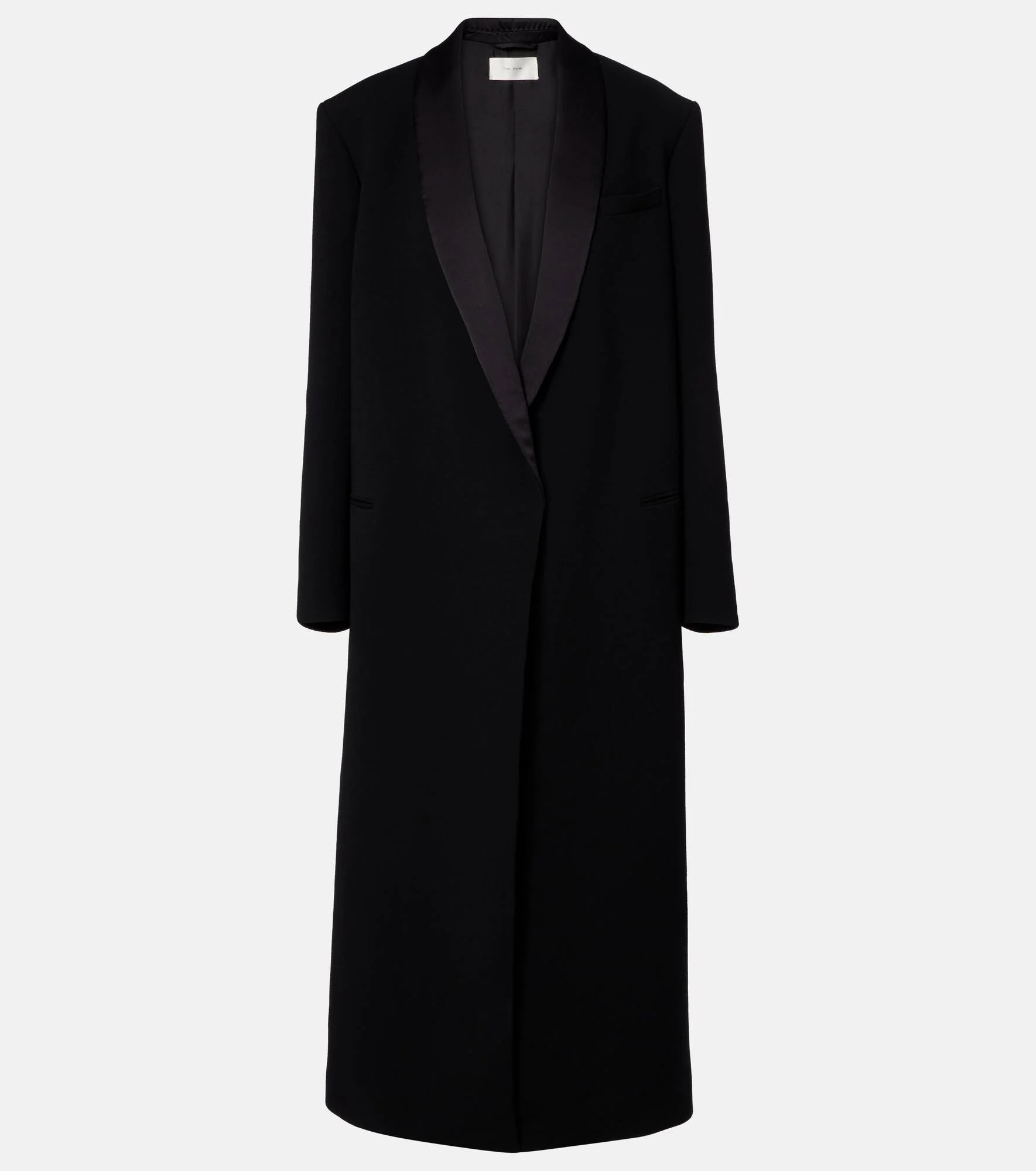 Refined tailoring is at the heart of The Row’s identity – the brand was named after Savile Row, London’s bespoke tailoring district. The Erdene coat is crafted from pure virgin wool and features a contrast lapel in silk. Product Details - Material: 100% virgin wool - Care instructions: dry clean - Made in Italy - Designer color name: Black - Item color: black - Material II: 100% silk - Lining: 100% silk - Shawl lapel - Pockets: breast pocket, welt pockets, internal pockets - Closure: open front - Vent: single - Item number: P01115440 Size & Fit - True to size - Shoulder pad inserts - Straight fit - Non-stretchy fabric - slit length 35cm-14" - Height of model is 175cm-69" and wears a size US 4