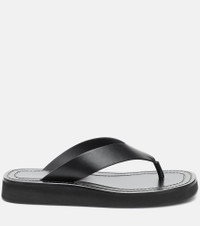 The Row returns to the early aughties as its source of inspiration for the Ginza platform sandal, a minimalist thong silhouette. Made in Italy from black calf leather with contrast top-stitching around the sole, it's a retro-meets-modern design that belongs in every well-curated wardrobe. Product Details - Toe shape: round open toe - Lining: leather - Sole: leather insole, rubber sole - Upper: calf leather - Made in Italy - Designer color name: Black - Item number: P00429211 Size & Fit - True to size - European sizes - 2cm-1" platform (size EU 38) - 3,5cm-1.5" wedge heel (size EU 38)