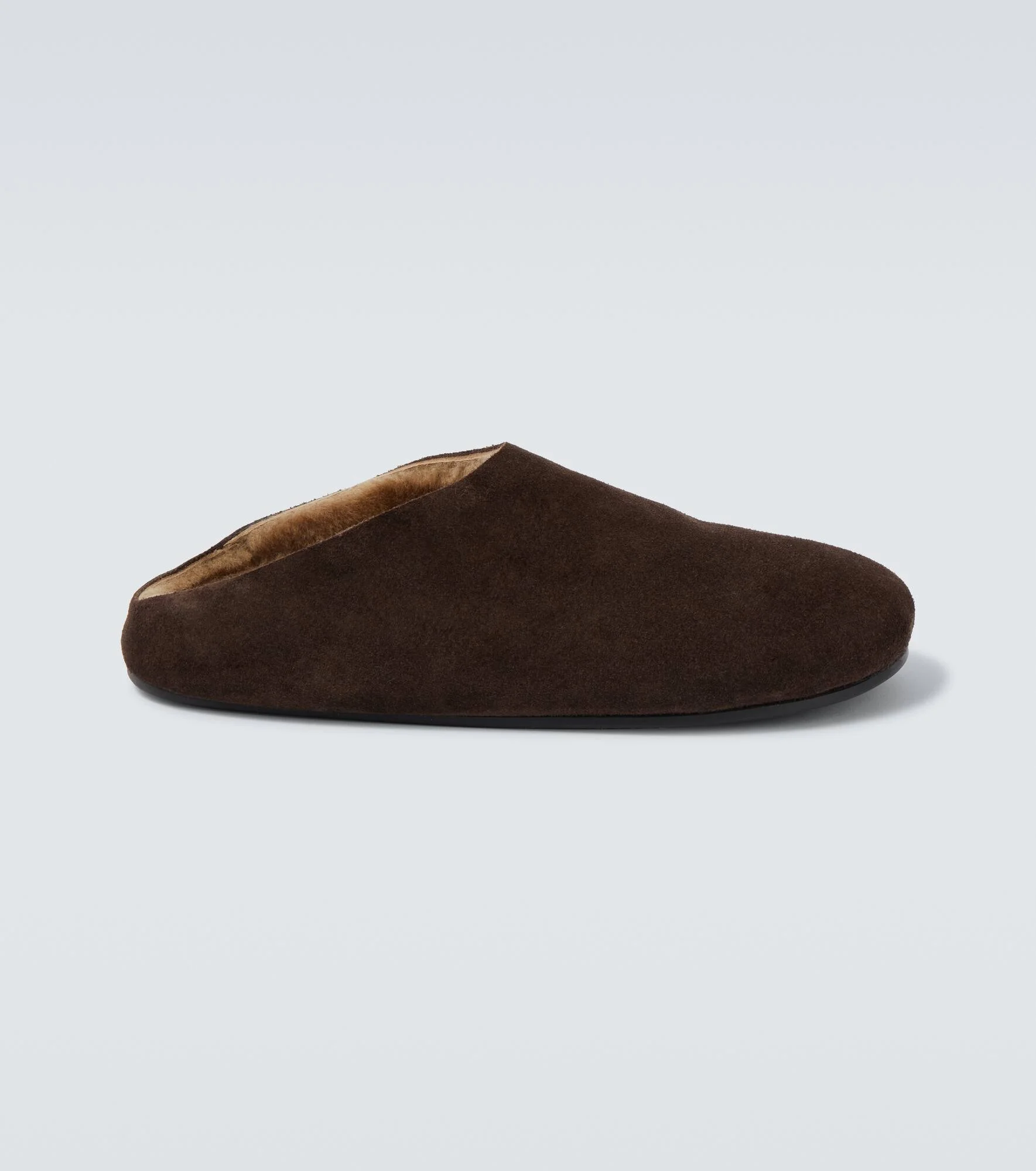 A deep affection for refined and timeless fashion influences The Row's dedication to craftsmanship and quality. The Hudson mules are made in Italy from brown suede with plush shearling lining. Product Details - Upper: leather (suede) - Lining: shearling - Sole: shearling insole, rubber sole - Toe shape: round toe - Made in Italy - Includes: shoe box - Designer color name: Lacquer Brown - Item color: brown - Item number: P01085393 Size & Fit - Fits small to size - we recommend trying one size larger - Half sizes please take the next size up - European sizes