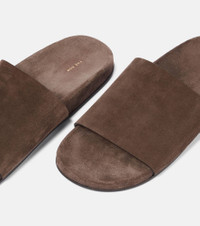 A deep affection for refined and timeless fashion influences The Row's dedication to craftsmanship and quality. Minimalist and versatile, the Hugh slides are meticulously made from tactile suede and pair well with effortless warm-weather ensembles. Product Details - Upper: cow leather (suede) - Lining: cow leather - Sole: leather insole, rubber sole - Toe shape: round open toe - Made in Italy - Includes: shoe box, dust bag - Designer color name: Lacquer Brown - Item color: brown - Item number: P01049355 Size & Fit - True to size - Slightly wide - Half sizes please take the next size down - European sizes - 1,5cm-0.5" wedge heel (size EU 38)