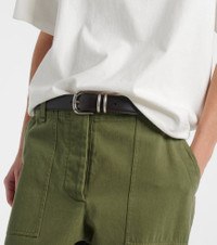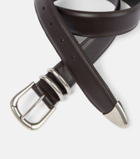 A deep affection for refined and timeless fashion influences The Row's dedication to craftsmanship and quality. This leather belt completes any sophisticated look with its eye-catching silver hardware on the curved buckle, double loop, and pointed tip. Product Details - Material: calf leather - Lining: leather - Made in Italy - Designer color name: DARK BROWN ANS - Item color: brown - Hardware color: silver - Item number: P01048819 Size & Fit - Width 3,5cm-1.5" - Buckle width 4,5cm-2" - Length of size XS = 74/84cm-29/33" - Length of size S = 79/89cm-31/35" - Length of size M = 82/92cm-32.5/36" - Length of size L = 89/99cm-35/39"