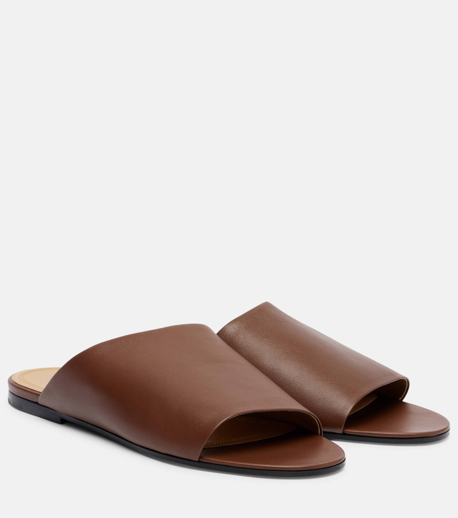 A deep affection for refined and timeless fashion influences The Row's dedication to craftsmanship and quality. Made from supple calfskin, the Signum slides boast a minimal silhouette with asymmetrical straps. Product Details - Upper: leather - Lining: leather - Sole: leather insole and sole - Toe shape: almond open toe - Made in Italy - Includes: dust bags, shoe box - Designer color name: Mousse - Item color: brown - Item number: P01049340 Size & Fit - True to size - For narrow feet, we recommend trying a half size smaller - European sizes - 1,5cm-0.5" heel (size EU 38)