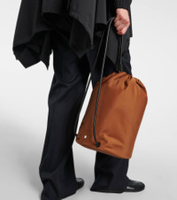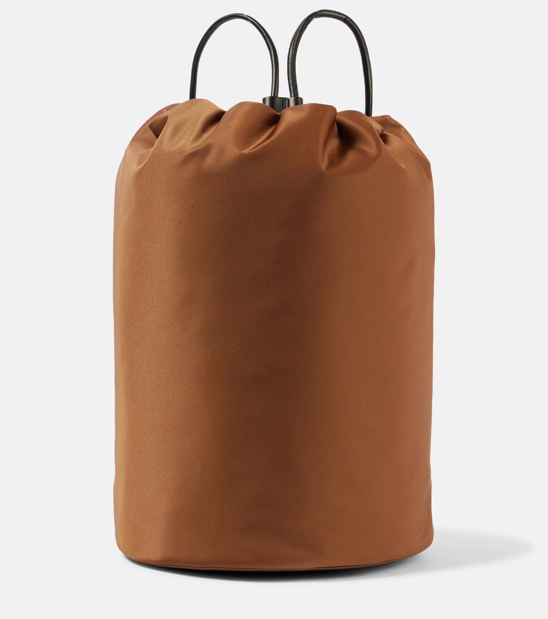 Product Details - Material: fabric - Lining: fabric - Made in Italy - Designer color name: Tan Pld - Trim: leather - Closure: drawstring top - Shoulder strap - Internal details: internal slot pocket - Includes: dust bag - Item number: P00928823 Size & Fit - Height 37cm-14.5" - Width 25cm-10" - Depth 25cm-10" - Length shoulder strap 60cm-23.5"