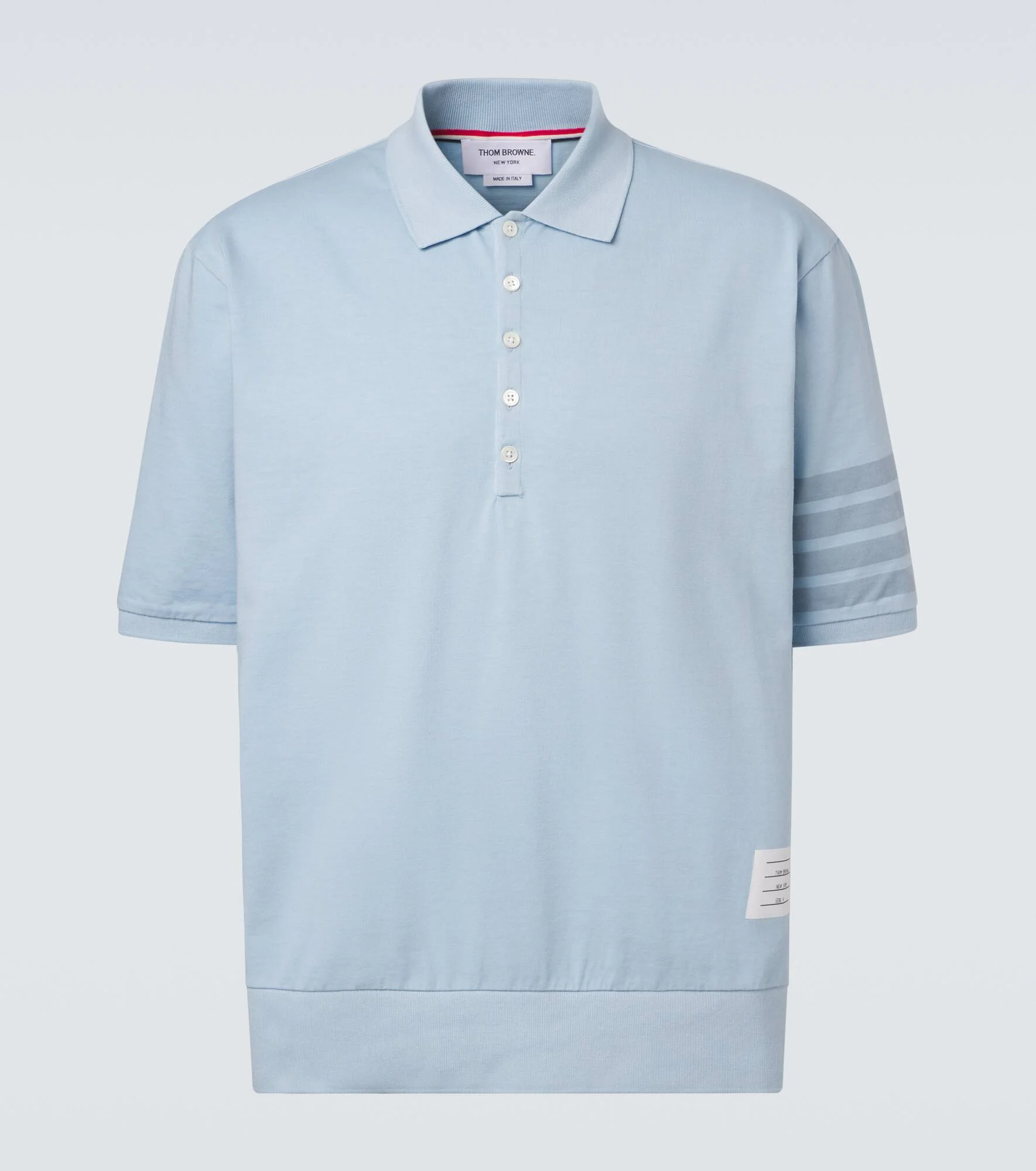 Contrasting 4-Bar horizontal stripes are a Thom Browne signature, dubbing the label’s designs as a ''modern uniform''. The distinctive pattern now features on the sleeve of this cotton jersey polo shirt. Product Details - Material: 100% cotton - Care instructions: machine wash at 30 degrees - Made in Italy - Color: blue - Designer color name: Light Blue - Details: 97% cotton, 3% elastane - Contains non-textile parts of animal origin - Collar: polo collar - Hem: ribbed - Item number: P01124065 Size & Fit - True to size - Straight fit - Slightly stretchy fabric - Falls to the hip - Height of model is 189cm-74.5" and wears a size 3