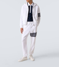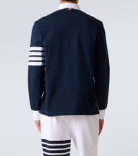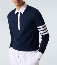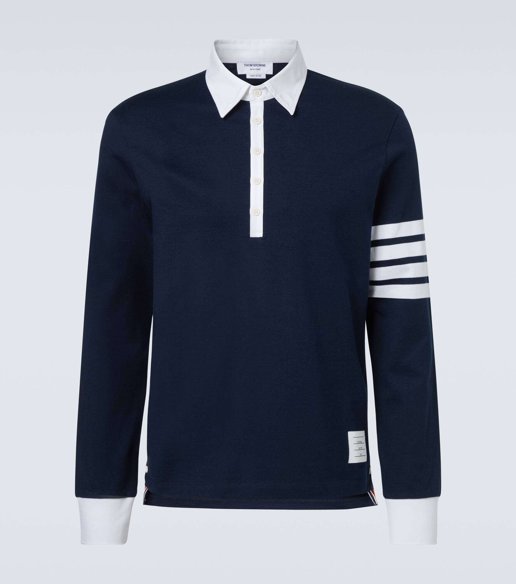 Contrasting 4-Bar horizontal stripes are a Thom Browne signature, dubbing the label’s designs as a ''modern uniform''. This navy polo sweater is crafted from cotton jersey and boasts the iconic motif and contrasting collar and cuffs. Product Details - Material: 100% cotton - Care instructions: machine wash at 30 degrees - Made in Italy - Designer color name: Navy - Item color: blue, white - Material II: 97% cotton, 3% elastane - Collar: classic (Straight point) - Closure: buttoned placket - Side slits - Item number: P01061798 Size & Fit - True to size - Straight fit - Slightly stretchy fabric - Falls to the hip - The model in the picture is 185cm-6'1" and wearing a size 3