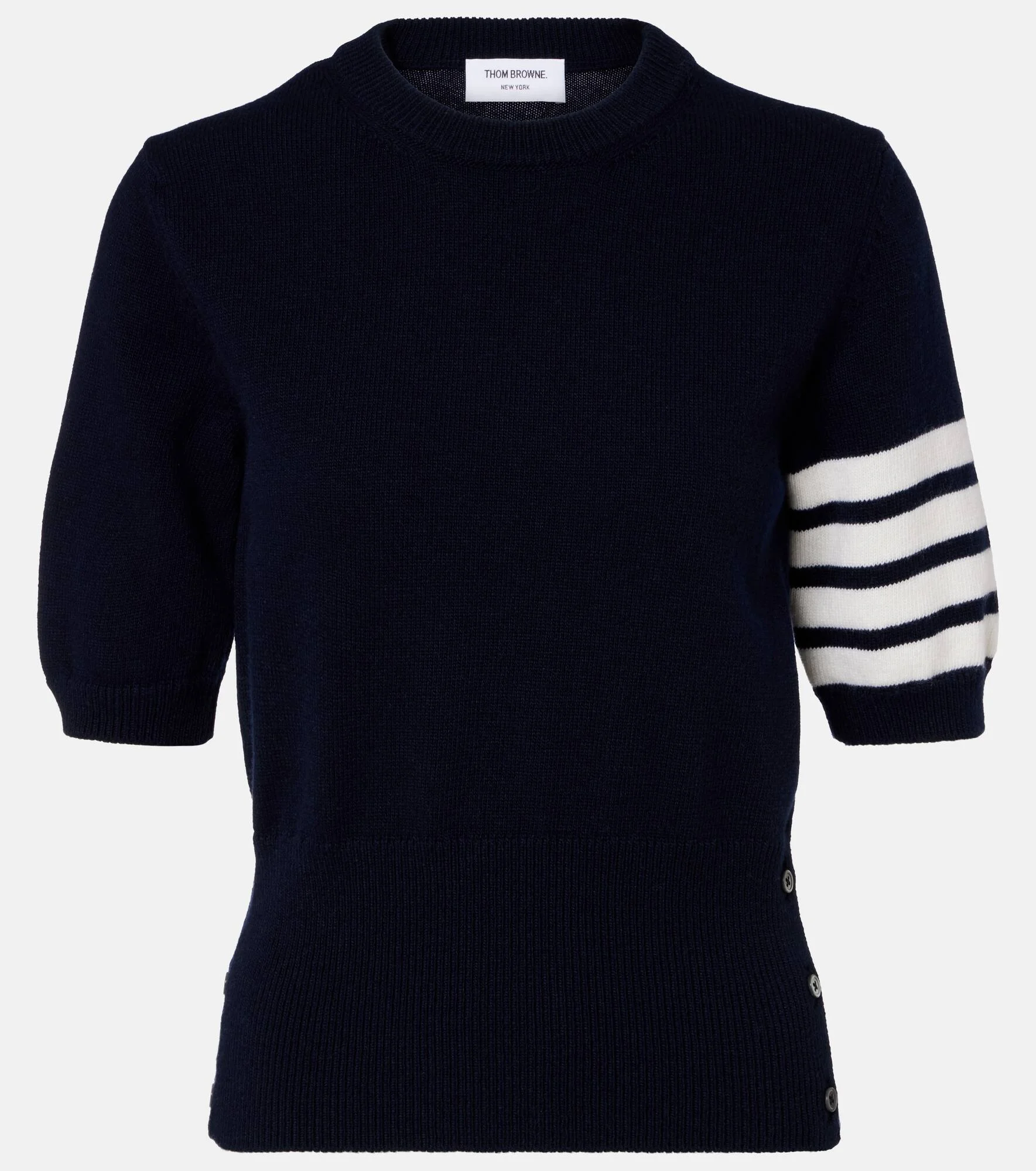 Crafted from virgin wool, this Thom Browne sweater features a relaxed, short-sleeved silhouette. The sophisticated design is complete with a crew neckline, ribbed trims, and the brand's 4-Bar stripe detail at the left sleeve. Product Details - Material: 100% virgin wool - Care instructions: dry clean - Made in Italy - Designer color name: Navy - Item color: blue - Contains non-textile parts of animal origin - Collar: crewneck - Cuff: ribbed - Hem: ribbed - Item number: P01104008 Size & Fit - True to size - Straight fit - Slightly stretchy fabric - Falls to the hip - The model seen in the picture is 178cm-5'10" and wearing a size IT 40