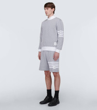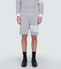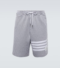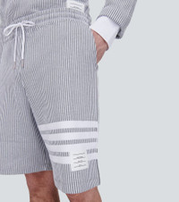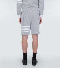 These striking shorts from Thom Browne are made from a striped cotton seersucker fabric. The style features a 4-Bar stripe detail on one thigh, an elasticated drawstring waist, and a signature tri-color loop tab at the back. Product Details - Made in Italy - Material II: 97% cotton, 3% elastane - Care instructions: dry clean - Material: 100% cotton - Item number: P00757048 Size & Fit - Fits small to size - we recommend trying one size larger - Designed for a loose fit - Elasticated waist - Adjustable at the waist - Mid-weight material - The model in the picture is 185cm-6'1" and wearing a size 3