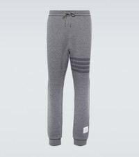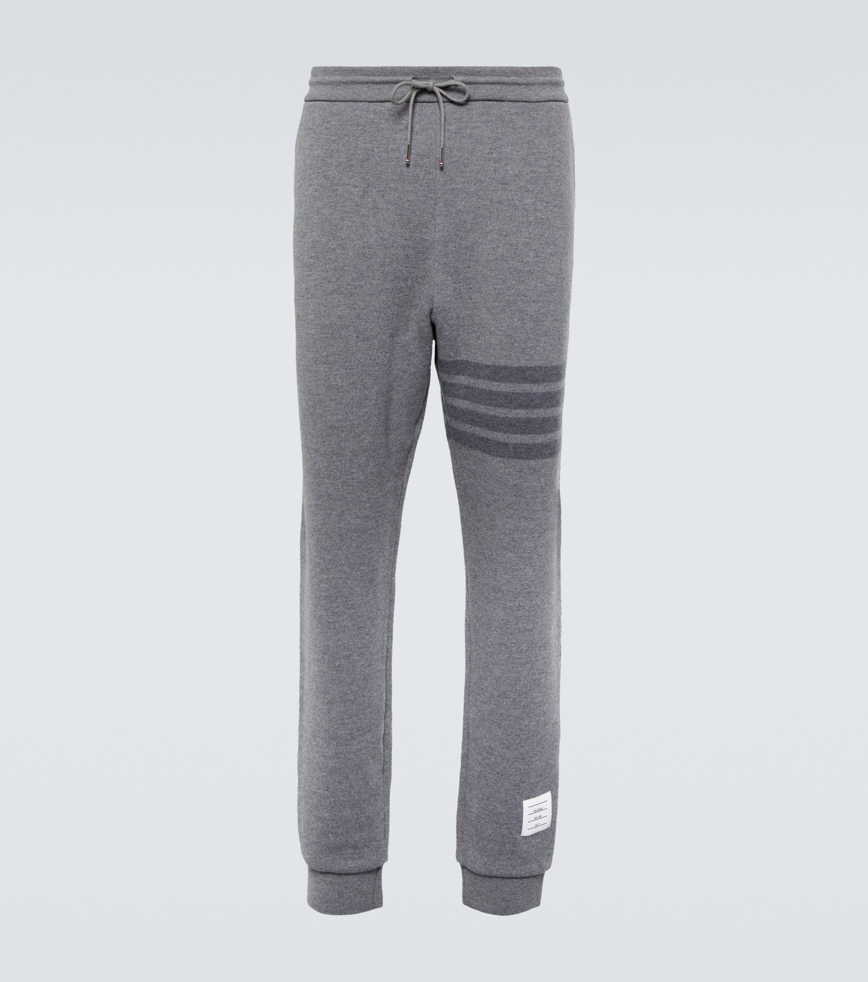 Contrasting 4-Bar horizontal stripes are a Thom Browne signature, dubbing the label’s designs as a "modern uniform." The motif appears on these virgin wool sweatpants. Product Details - Material: 97% wool, 3% elastane - Care instructions: dry clean - Made in Italy - Designer color name: Lt Grey - Elasticated drawstring waist - Pockets: side slit pockets - Item number: P00821928 Size & Fit - Fits small to size - we recommend trying one size larger - Elasticated waist - Adjustable at the waist - Mid-weight material - Tapered leg - The model in the picture is 185cm-6'1" and wearing a size 3