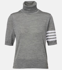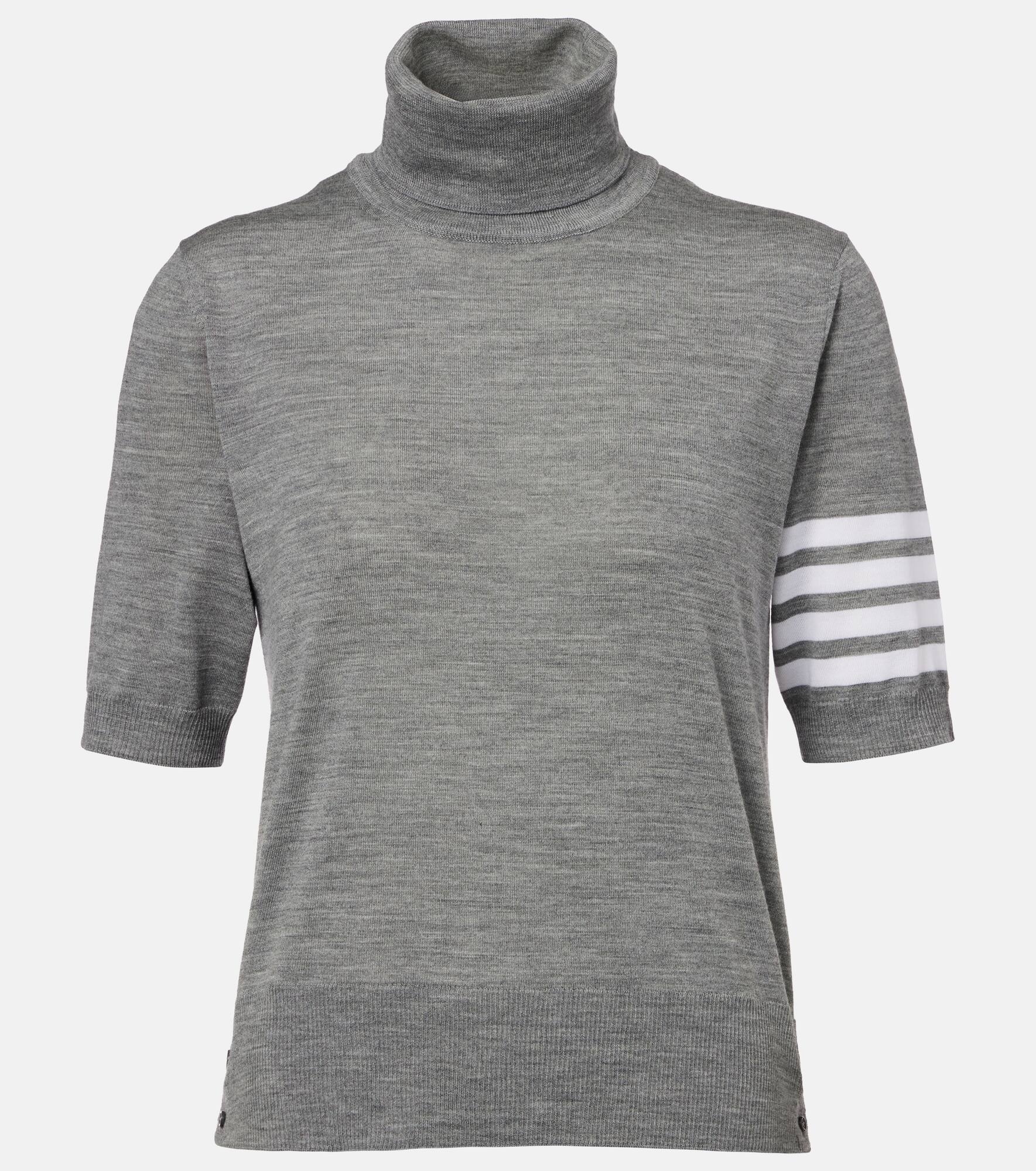 Crafted from fine wool, this Thom Browne turtleneck sweater features a relaxed, short sleeve silhouette. The sophisticated design is complete with ribbed trims and the brand's 4-bar stripe detail at the left sleeve. Product Details - Material: 99% virgin wool, 1% polyamide - Care instructions: hand wash - Made in Italy - Designer color name: Light Grey - Item color: gray - Collar: turtleneck - Cuff: ribbed - Hem: ribbed - Closure: button fastening - Item number: P01052030 Size & Fit - True to size - Straight fit - Stretchy fabric - Falls to the hip - The model seen in the picture is 178cm-5'10" and wearing a size IT 40