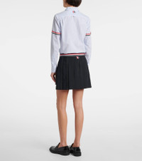 Crafted in Italy from a wool-blend, this miniskirt from Thom Browne features the brand's signature striped grosgrain trims. The design is finished with an uneven hem and a buttoned front for closure. Product Details - Material: 50% wool, 50% polyester - Care instructions: dry clean - Made in Italy - Designer color name: Black - Item color: black - Closure: buttoned front - Hem: uneven - Unlined - Item number: P01052038 Size & Fit - True to size - Non-stretchy fabric - The model seen in the picture is 178cm-5'10" and wearing a size IT 40