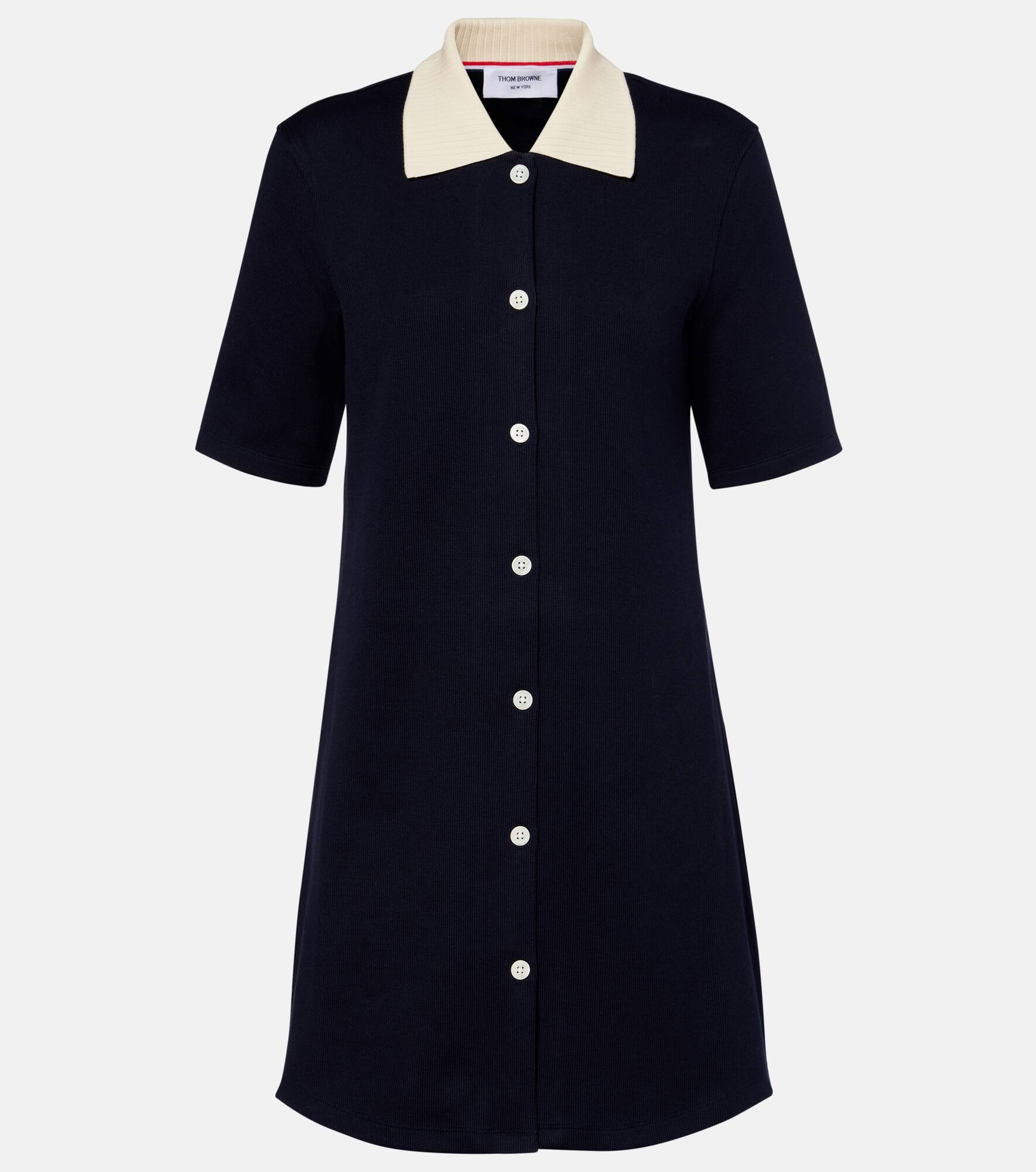 Thom Browne has gained global attention for redefining contemporary tailoring and creating a modern uniform. This polo dress is crafted from a double-faced cotton knit and is complete with subtle branding on the back of the collar. Product Details - Material: 100% cotton - Care instructions: hand wash - Made in Japan - Designer color name: Navy - Item color: blue, white - Closure: buttoned front - Collar: polo collar - Item number: P01052027 Size & Fit - True to size - Straight fit - Stretchy fabric - The model seen in the picture is 178cm-5'10" and wearing a size IT 40