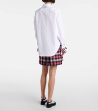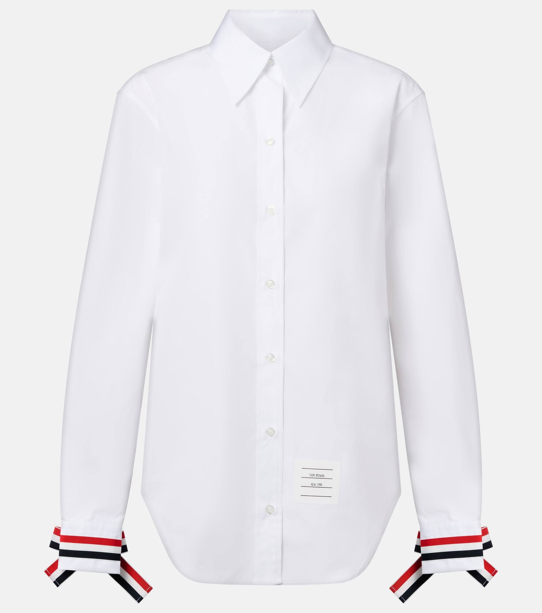 This enchanting shirt marries the enduring elegance of classic shirting with a signature touch by Thom Browne. Crafted with fine cotton poplin fabric, this design features a delicate bow at the collar and the tricolor grosgrain loop tab at the back neck. Product Details - Material: 100% cotton - Care instructions: machine wash at 40 degrees - Made in Italy - Designer color name: White - Item color: white - Contains non-textile parts of animal origin - Collar: classic (Straight point) - Closure: buttoned placket - Standard placket - Cuff: buttoned - Hem: rounded - Item number: P01079832 Size & Fit - True to size - Straight fit - Non-stretchy fabric - Falls below the hip - The model seen in the picture is 178cm-5'10" and wearing a size IT 40
