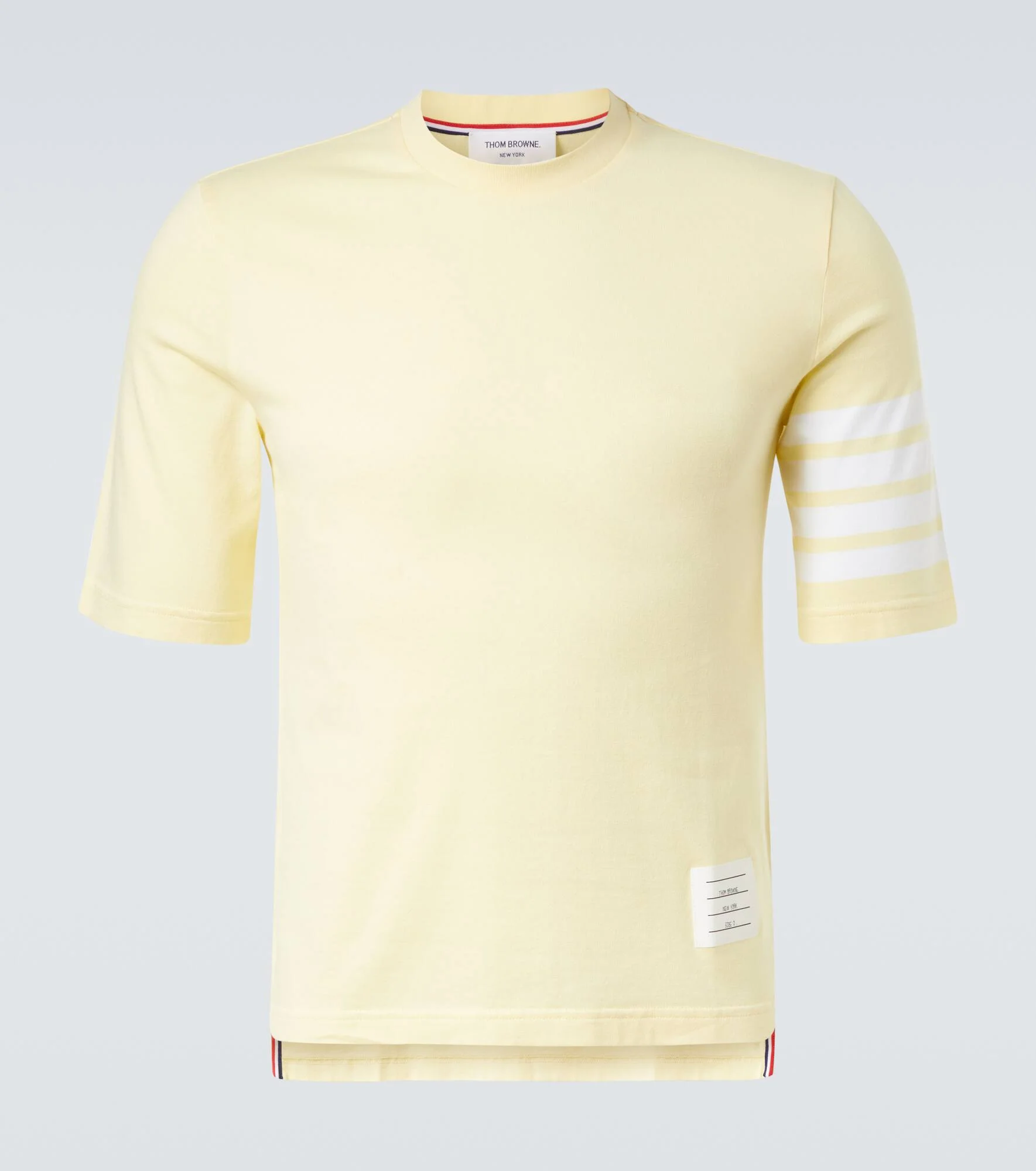 Thom Browne has gained global attention for redefining contemporary tailoring and creating a modern uniform. Crafted in Italy from pure cotton, this T-shirt features stripes on one of its arms. Product Details - Material: 100% cotton - Care instructions: machine wash at 30 degrees - Made in Italy - Designer color name: Yellow - Item color: yellow - Trim: 100% cotton - Item number: P01061811 Size & Fit - True to size - Designed for a loose fit - Non-stretchy fabric - Falls to the hip - The model in the picture is 185cm-6'1" and wearing a size 3
