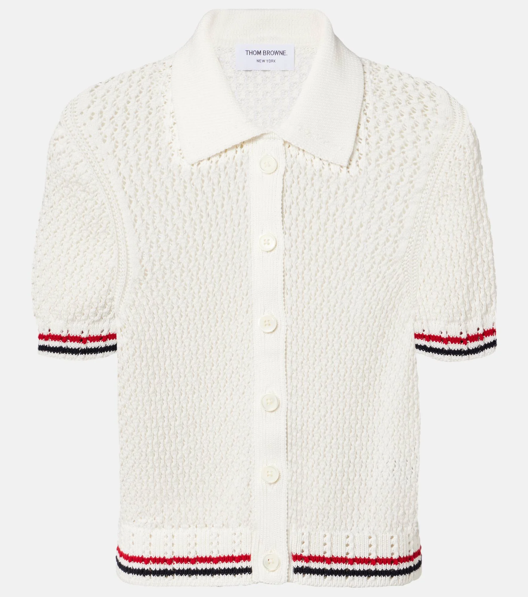 Tricolor grosgrain trims add a preppy touch to Thom Browne’s Americana-led designs. This cardigan-inspired top is crafted from cotton with a pointelle knit and is complete with the iconic signature. Product Details - Material: 100% cotton - Care instructions: hand wash - Made in Ireland - Color: white - Designer color name: White - Contains non-textile parts of animal origin - Collar: polo collar - Closure: buttoned front - Item number: P01121311 Size & Fit - True to size - Semi-sheer - Straight fit - Slightly stretchy fabric - Slightly cropped - The model seen in the picture is 178cm-5'10" and wearing a size IT 40