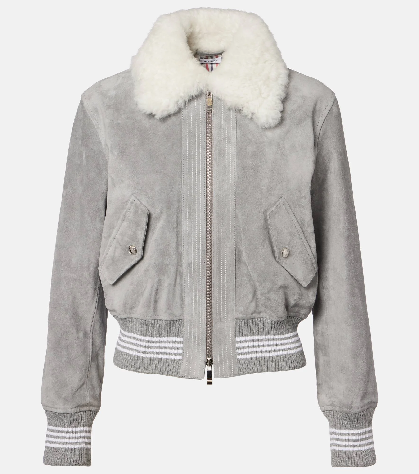 Thom Browne has gained global attention for redefining contemporary tailoring and creating a modern uniform. Expertly crafted from velvety suede, this jacket marries style and function with a plush shearling collar and a cropped silhouette, finished with engraved buttons. Product Details - Material: 100% calf leather (suede) - Care instructions: specialist clean - Made in Italy - Designer color name: Med Grey - Item color: gray - Material II: 45% wool, 45% acrylic, 6% polyamide, 4% elastane - Trim: 100% shearling - Lining: 100% cupro - Hardware color: silver - Closure: two-way zipped front - Pockets: snap-buttoned pockets, internal pockets - Cuff: ribbed - Hem: ribbed - Item number: P01079837 Size & Fit - True to size - For a looser fit, we recommend taking one size up - Straight fit - Elasticated hem - Non-stretchy fabric - Slightly cropped - The model seen in the picture is 178cm-5'10" and wearing a size IT 40
