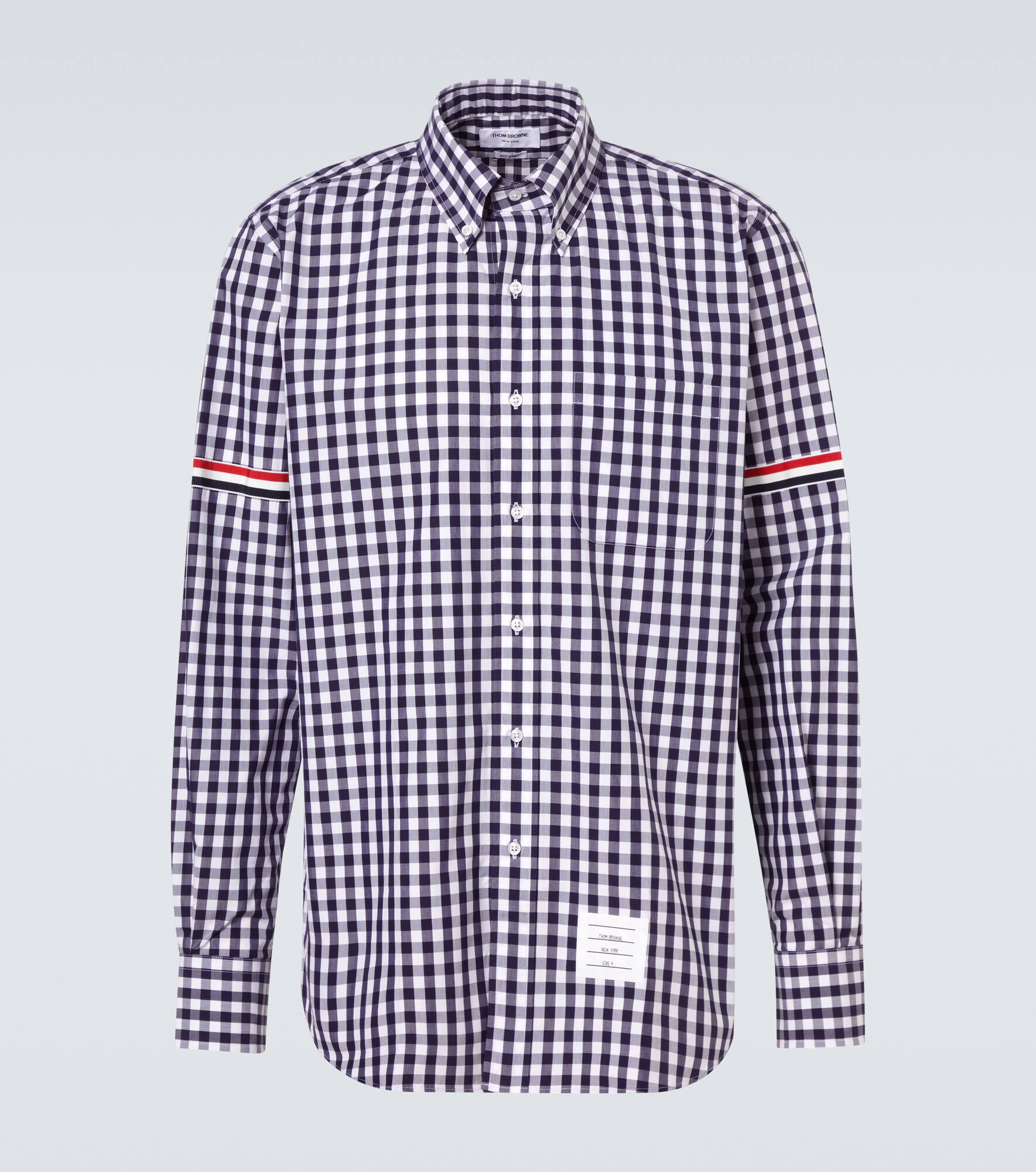 Tricolor grosgrain trims add a preppy touch to Thom Browne’s Americana-led designs. The iconic Stripe Oxford Armbands adorn the sleeves of this classic cotton shirt, finished with a playful gingham print. Product Details - Material: 100% cotton - Care instructions: machine wash at 40 degrees - Made in Italy - Designer color name: Navy - Item color: blue - Collar: button-down - Closure: buttoned front - Cuff: buttoned - Pockets: breast pocket - Contains non-textile parts of animal origin - Item number: P01053970 Size & Fit - True to size - With pleats in the back - Classic fit - Non-stretchy fabric - Falls below the hip - Height of model is 189cm-74.5" and wears a size 3