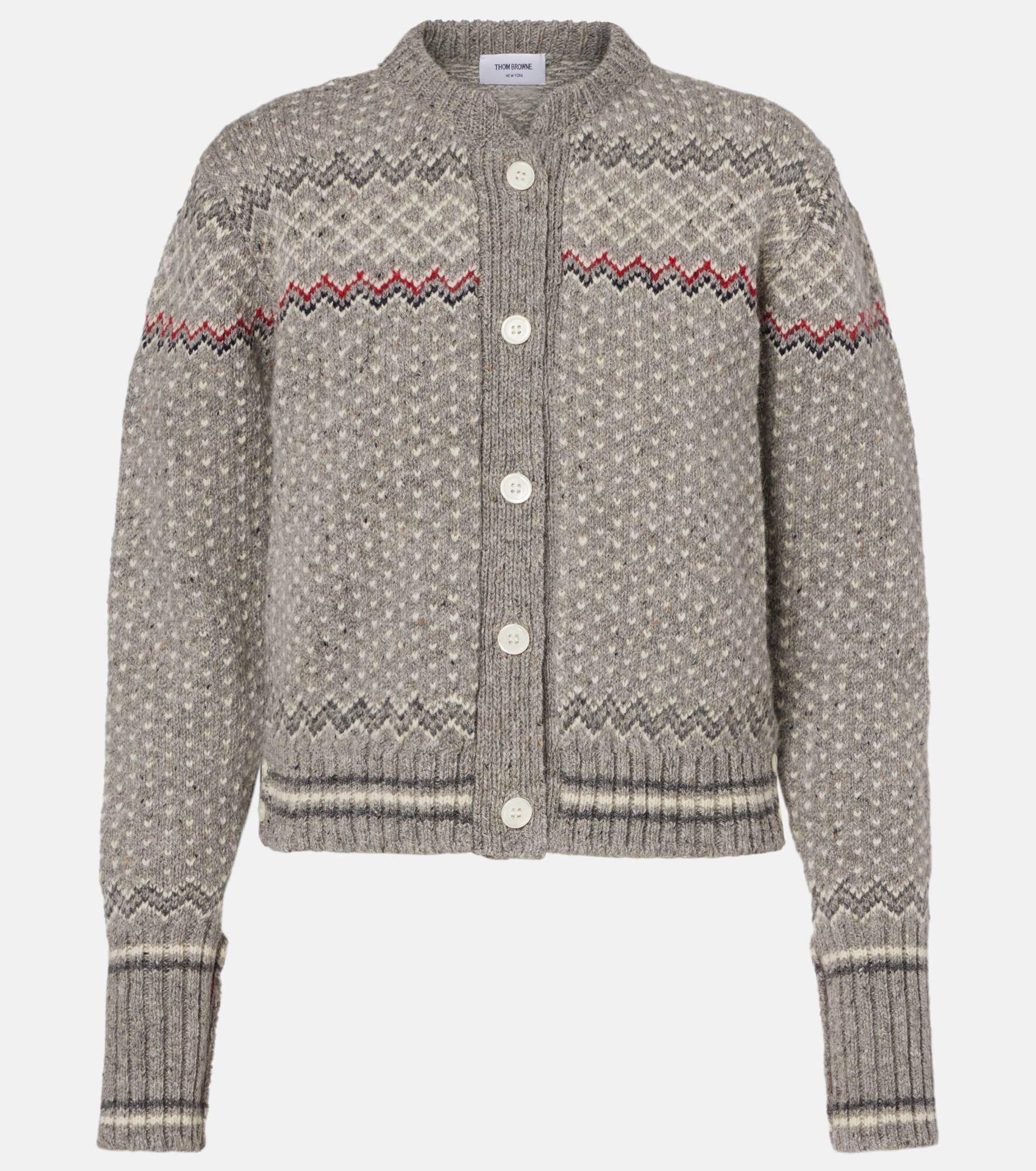 This cardigan is made from a cozy wool and mohair yarn – knitted into a Fair Isle-inspired pattern. Tricolor grosgrain trims add a preppy touch to Thom Browne’s Americana-led designs. Product Details - Material: 70% wool, 30% mohair - Care instructions: dry clean - Made in Ireland - Designer color name: Lt Grey - Item color: gray - Contains non-textile parts of animal origin - Cuff: three buttons - Closure: buttoned front - Hem: knit - Item number: P01079844 Size & Fit - True to size - Straight fit - Non-stretchy fabric - Falls to the hip - The model seen in the picture is 178cm-5'10" and wearing a size IT 40