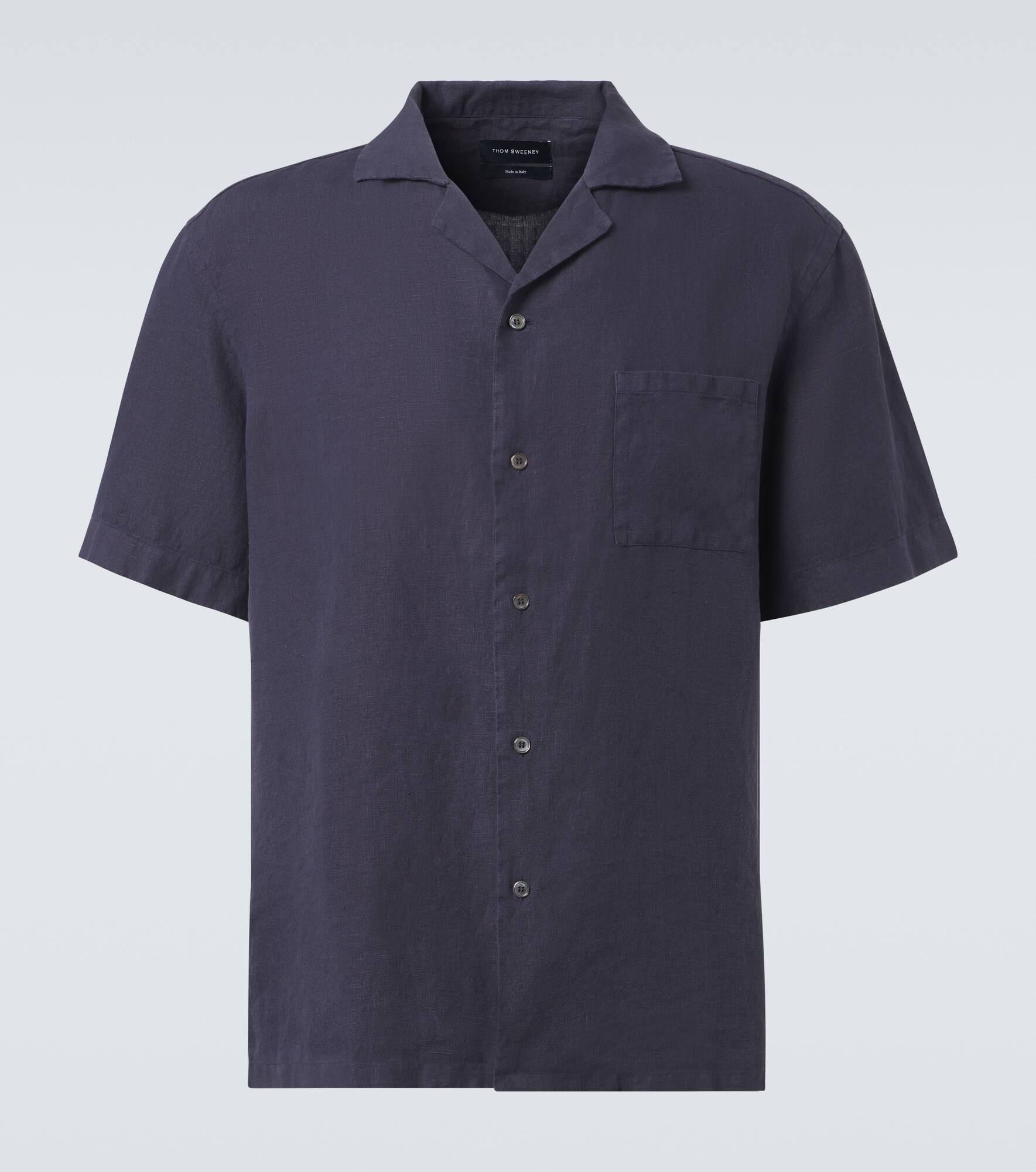 Crafted in Italy, this pure linen shirt from Thom Sweeney is perfect for relaxed summer days with its lightweight fabrication and classic fit. Complemented by a camp collar, one chest pocket, and buttoned-front closure, it offers effortless sophistication. Product Details - Material: 100% linen - Care instructions: machine wash at 30 degrees - Made in Italy - Designer color name: Navy - Item color: blue - Closure: buttoned front - Pockets: breast pocket - Contains non-textile parts of animal origin - Item number: P01034613 Size & Fit - True to size - Dropped shoulders - Classic fit - Non-stretchy fabric - Falls below the hip - Height of model is 189cm-74.5" and wears a size 16