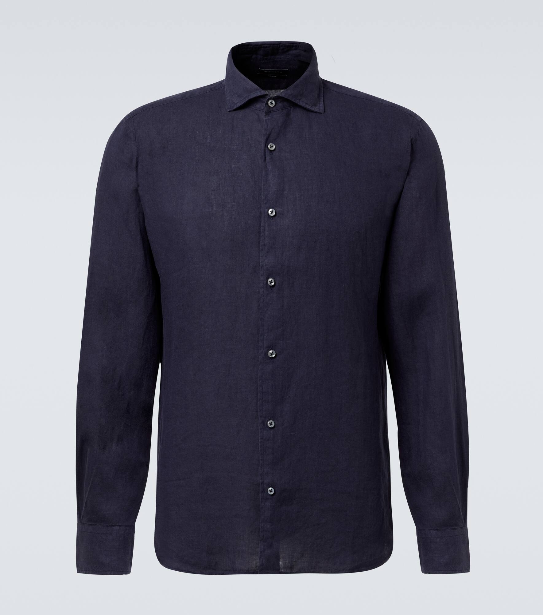 Crafted to perfection, this shirt from Thom Sweeney boasts effortless British flair. It's made from pure linen that's both lightweight and breathable and features a cutaway collar. Product Details - Material: 100% linen - Care instructions: machine wash at 30 degrees - Made in Italy - Designer color name: Navy - Item color: blue - Closure: buttoned front - Contains non-textile parts of animal origin - Item number: P01034601 Size & Fit - True to size - Without pleats in the back - Slim fit - Non-stretchy fabric - Falls to the hip - Height of model is 190cm-75" and wears a size 16