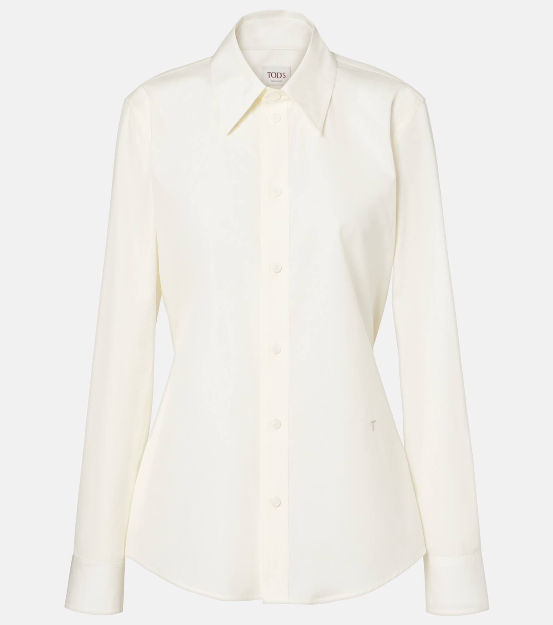 Tod's embodies the art of Italian craftsmanship with superior fabrications and timeless silhouettes that lend a sense of quiet sophistication. Crafted from pure cotton poplin, this shirt features an adjustable belt with mother-of-pearl buttons for a sleek finish. Product Details - Material: 100% cotton - Care instructions: hand wash - Made in Italy - Designer color name: Bianco - Item color: white - Contains non-textile parts of animal origin - Closure: buttoned front, belted waist - Collar: classic (Straight point) - Cuff: buttoned - Item number: P01069714 Size & Fit - True to size - Loose fit, comes with belt - Non-stretchy fabric - Falls below the hip - The model seen in the picture is 178cm-5'10" and wearing a size IT 40