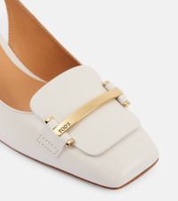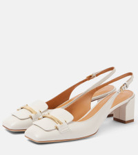 These slingback pumps from Tod’s combine modern design with exceptional Italian craftsmanship. Crafted from leather, the design features loafer-inspired vamps accented with logo-embossed gold-tone bars. Product Details - Upper: leather - Lining: leather - Sole: leather insole and sole - Toe shape: square toe - Made in Italy - Includes: shoe box, dust bag - Designer color name: Bianco Calce - Hardware color: gold - Closure: buckle fastening - Item number: P01015206 Size & Fit - True to size - European sizes - 6cm-2.5" heel (size EU 38)