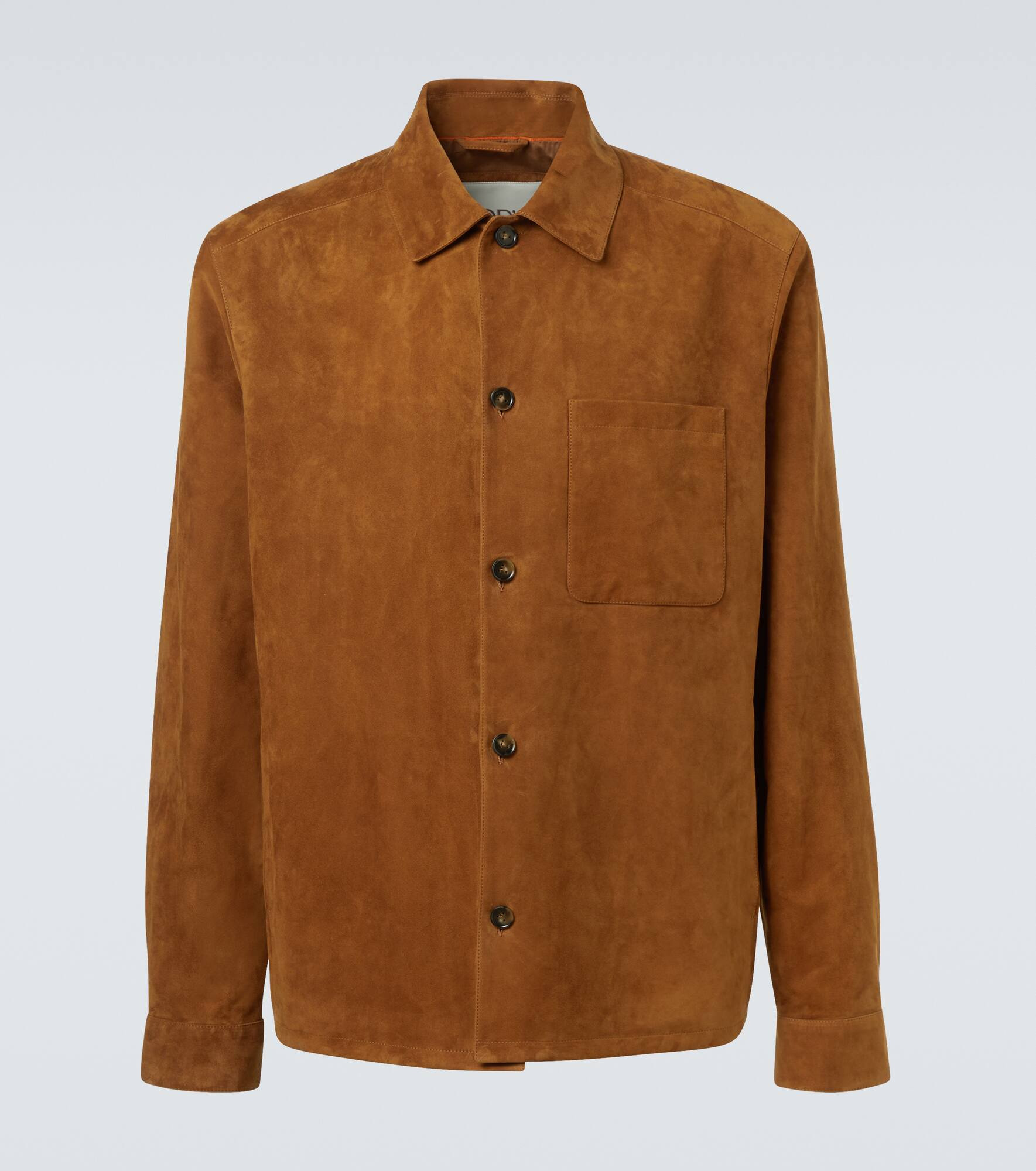 Tod's embodies the art of Italian craftsmanship with superior fabrications and timeless silhouettes that lend a sense of quiet sophistication. This overshirt is crafted from extra-soft suede with anti-drip and anti-stain treatments. Product Details - Material: 100% lamb leather (suede) - Care instructions: do not wash - Made in Italy - Designer color name: Caramello Scuro - Item color: brown - Lining: 100% cotton - Sleeve lining: 100% cupro - Pockets: patch pockets, side slit pockets, internal pockets - Cuff: buttoned - Closure: buttoned front - Item number: P01062201 Size & Fit - True to size - Straight fit - Non-stretchy fabric - Falls below the hip - Height of model is 188cm-74" and wears a size L