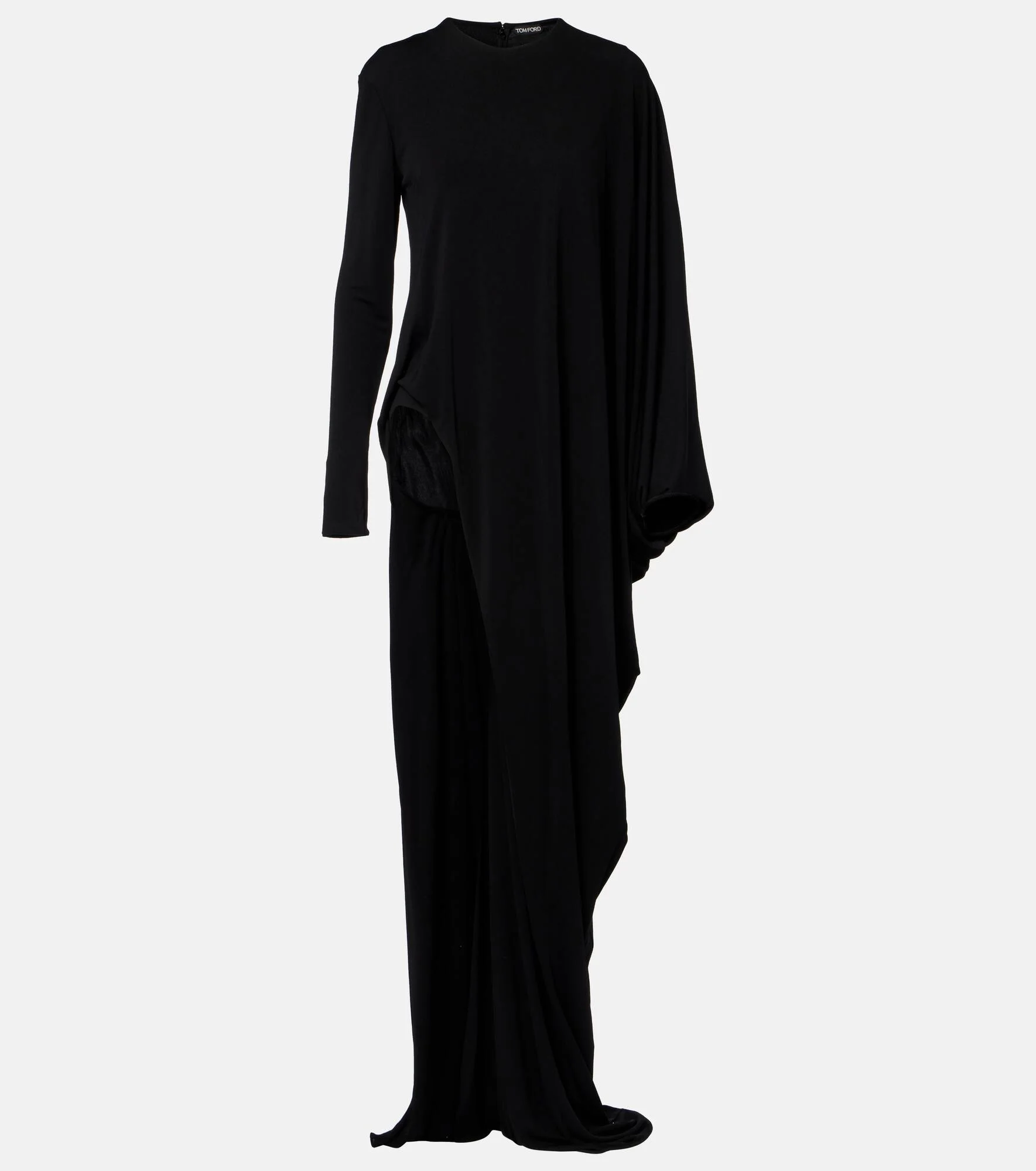 A crescent cutout defines the asymmetric hem of this Tom Ford maxi dress. Made in Italy, the daring silhouette arrives with an internal mesh bodysuit under the fluid crepe jersey fabrication. Product Details - Material: 100% viscose - Care instructions: dry clean - Made in Italy - Designer color name: Black - Item color: black - Material II: 81% polyamide, 19% elastane - Closure: concealed zipped back - Item number: P01077403 Size & Fit - True to size - Designed for a loose fit - Slightly stretchy fabric - High-cut leg - The model seen in the picture is 178cm-5'10" and wearing a size IT 38