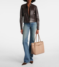 The Audrey Medium tote bag reflects Tom Ford’s blend of bold elegance and precise tailoring. Crafted from leather, this piece showcases the brand's signature T detail and a functional leather belt that adjusts the bag's size. Product Details - Material: calf leather - Lining: suede - Made in Italy - Designer color name: Light Beige - Item color: beige - Top handles - Internal details: internal zipped pocket - Closure: open top - Item number: P01038693 Size & Fit - Height 29cm-11.5" - Width 33cm-13" - Depth 15cm-6" - Length of handles 57cm-22.5"