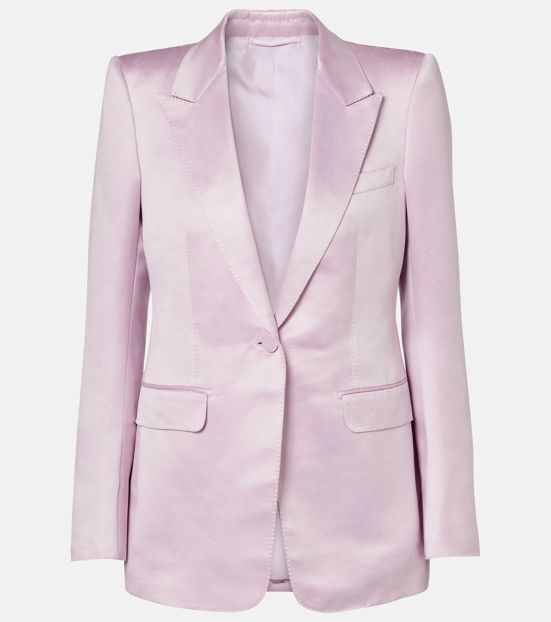 Tom Ford’s tailoring showcases meticulous attention to detail with a dose of high-octane glamour. This single-breasted blazer is made from washed cotton and silk Duchesse satin. Product Details - Material: 61% cotton, 39% silk - Care instructions: dry clean - Made in Switzerland - Designer color name: Orchid Pink - Item color: pink - Lining: 59% cupro, 41% silk - Peak lapel - Pockets: breast pocket, flap pockets, internal pockets - Closure: single-breasted (one button) - Vent: single - Item number: P01077409 Size & Fit - True to size - Shoulder pad inserts - Cinched waist - Non-stretchy fabric - Falls below the hip - slit length 25cm-10" - The model seen in the picture is 178cm-5'10" and wearing a size IT 38