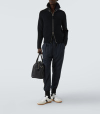 Product Details - Material: 90% cotton, 10% silk - Care instructions: dry clean - Made in Italy - Designer color name: Black & Chalk - Item color: black - Material II: 100% calf leather - Material III: 90% cotton, 8% polyamide, 2% elastane - Details: 100% water-buffalo horn - Pockets: side slit pockets, back pockets - Drawstring waist - Item number: P01042743 Size & Fit - True to size - Elasticated waist - Adjustable at the waist - Non-stretchy fabric - Tapered leg - The model in the picture is 185cm-6'1" and wearing a size 32