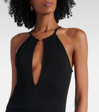 Tom Ford’s tailoring showcases meticulous attention to detail with a dose of high-octane glamour. Crafted from crepe jersey, this halterneck gown is shaped with a deep back slit and a front cutout finished with a golden signature buckle. Product Details - Material: 100% viscose - Care instructions: dry clean - Made in Italy - Designer color name: Black - Item color: black - Fully lined - Long vent - Item number: P01053680 Size & Fit - True to size - Fitted - Slightly stretchy fabric - slit length 75cm-29.5" - The model seen in the picture is 178cm-5'10" and wearing a size IT 38