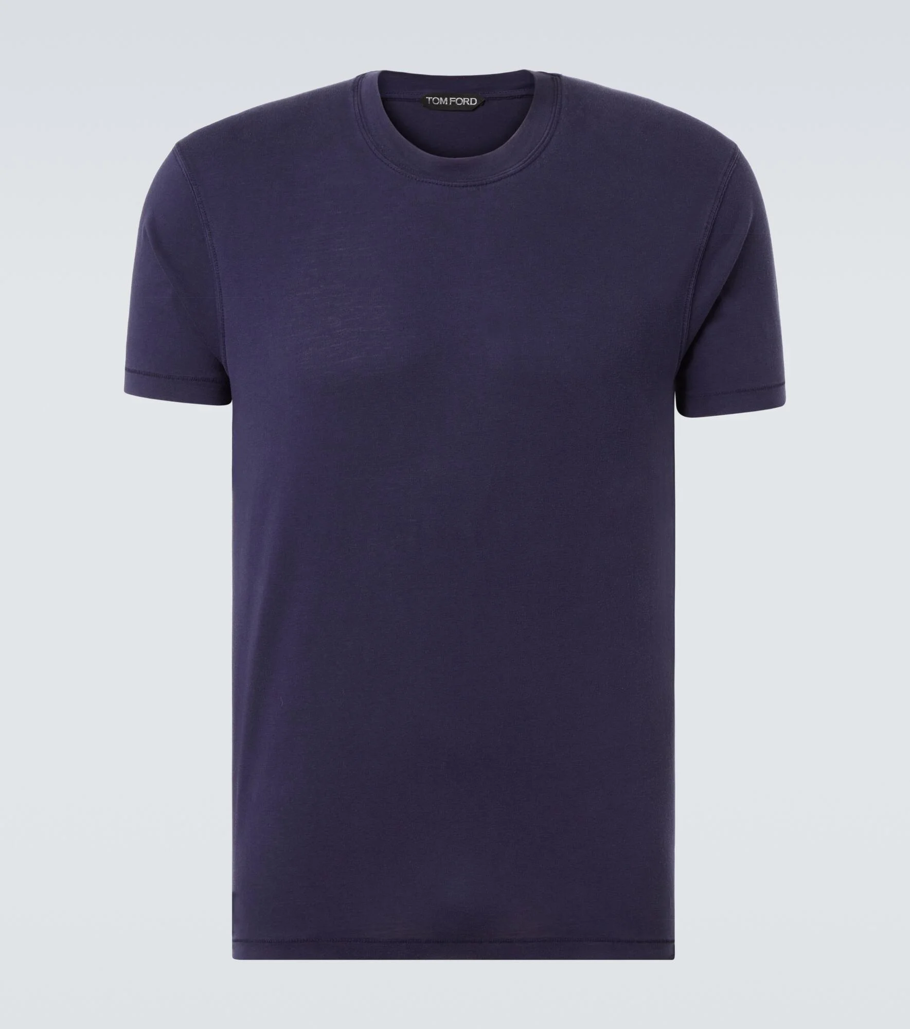 One of the most celebrated designers of all time, Tom Ford is a master at balancing high-octane glamour with modern masculinity. Made in Portugal from jersey, this T-shirt is a classic crewneck style. Product Details - Material: 67% lyocell, 33% cotton - Care instructions: dry clean - Made in Portugal - Color: blue - Designer color name: Navy Blazer - Collar: crewneck - Item number: P01097032 Size & Fit - True to size - Slim fit - Stretchy fabric - Falls to the hip - The model in the picture is 185cm-6'1" and wearing a size IT 50