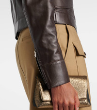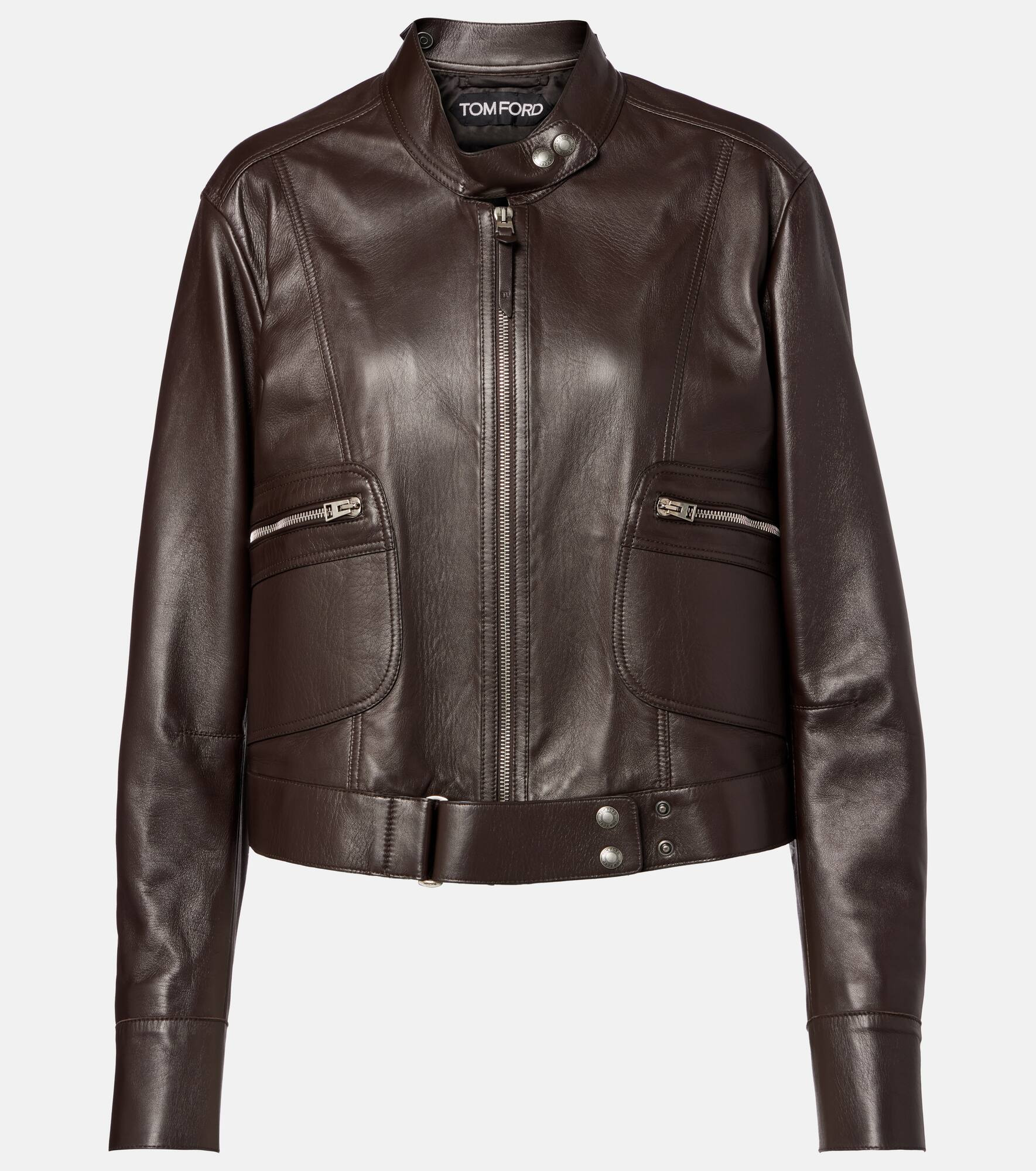 Tom Ford’s designs embody modern sophistication with fine materials and sleek silhouettes. This leather jacket features a zip-up front and two practical pockets, while the belted waist adds a twist to the look. Product Details - Material: 100% lamb leather - Care instructions: specialist clean - Made in Italy - Designer color name: Dark Chocolate - Item color: brown - Lining: 100% viscose - Contains non-textile parts of animal origin - Closure: two-way zipped front with snap-button fastenings - Cuff: zipped - Pockets: zipped pockets - Attached belt - Includes: garment bag - Item number: P01053662 Size & Fit - True to size - Straight fit - Non-stretchy fabric - Slightly cropped - The model seen in the picture is 178cm-5'10" and wearing a size IT 38